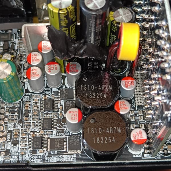 Независимые источники +3.3VDC и 5VDC установлены также на основной печатной плате и, по традиции, дополнительных теплоотводов не имеют — это вполне типично для блоков питания с активным охлаждением.