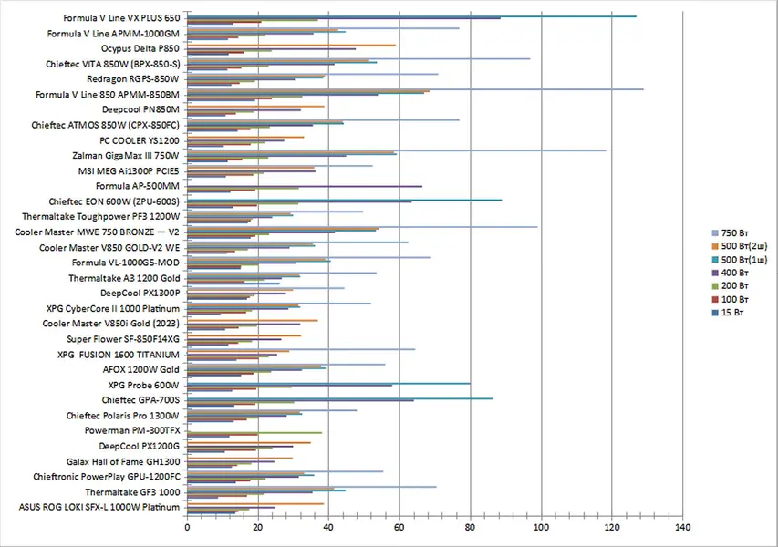 | Thermaltake GF1 1000 | 15,2 | 18,1 | 21,5 | 31,5 | 38,0 | 37,3 | 65,0 |