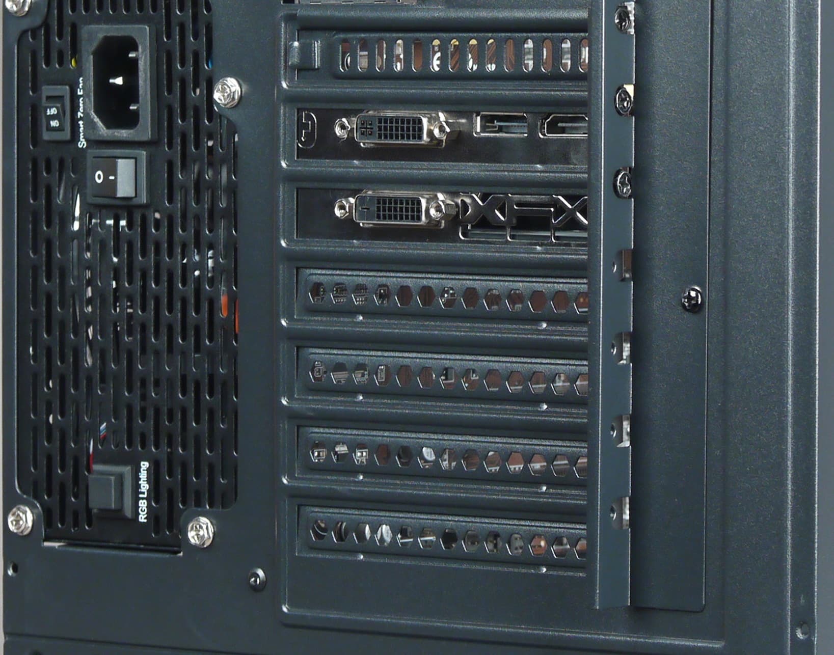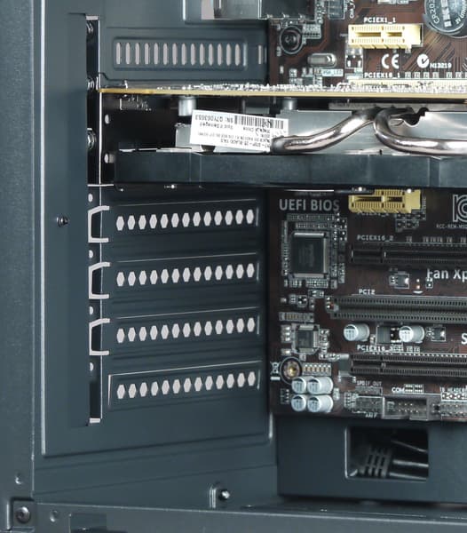 На задней стенке есть семь прорезей, шесть с одноразовыми заглушками, которые надо выламывать, и одна заглушка, верхняя, многоразовая. Платы расширения в прорезях крепятся винтами с головками под крестовую отвертку (такие есть в комплекте), доступ к ним снаружи корпуса, есть и дополнительная прижимная пластина, фиксируемая одним винтом с такой же головкой.