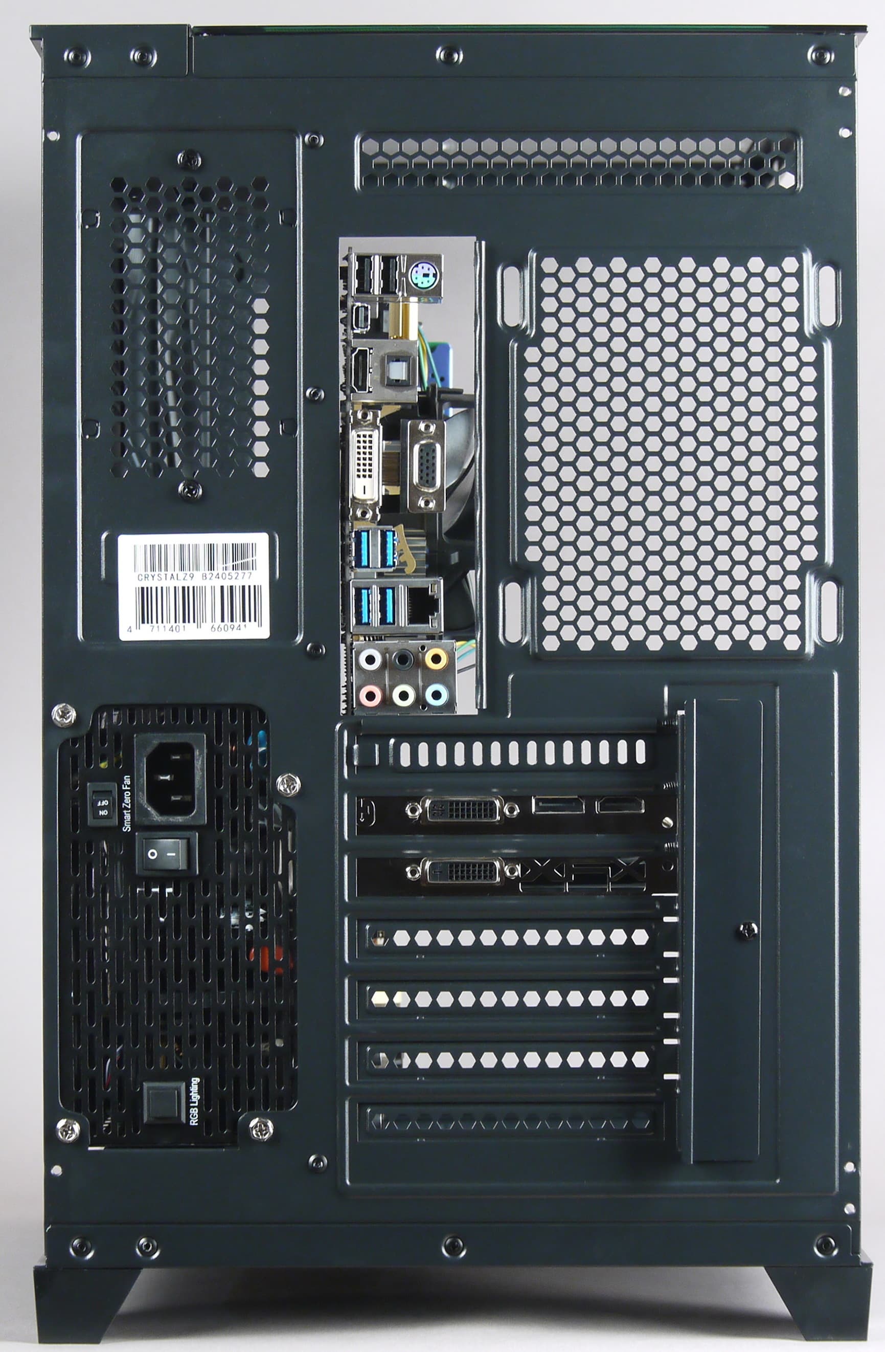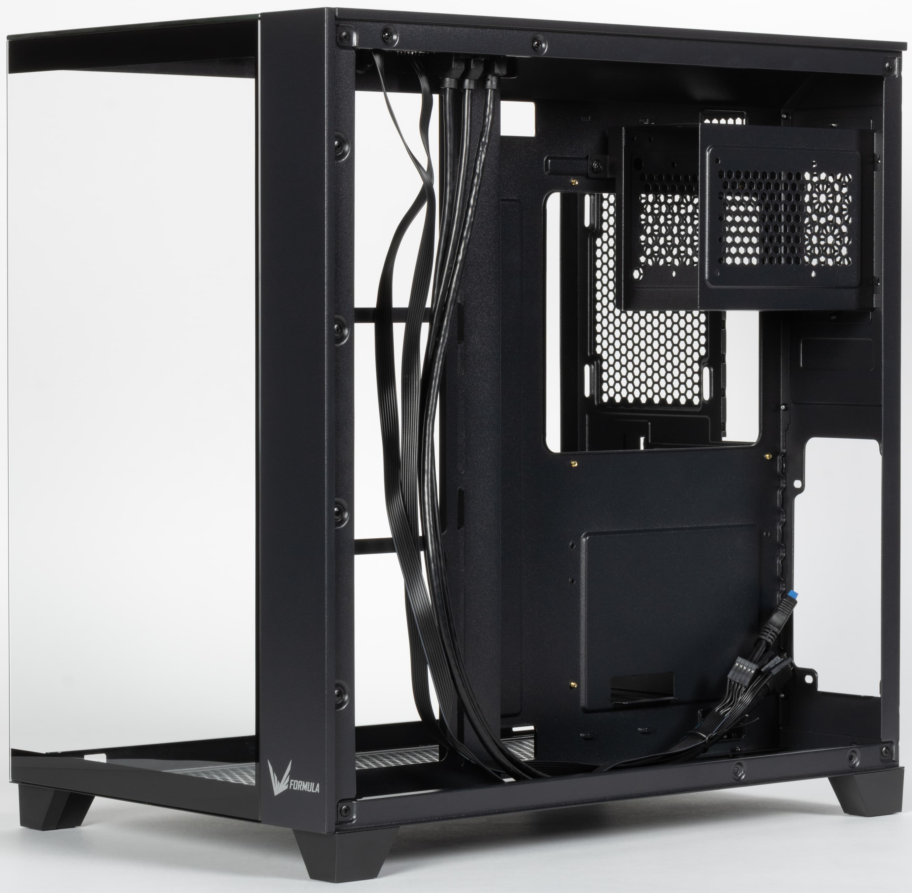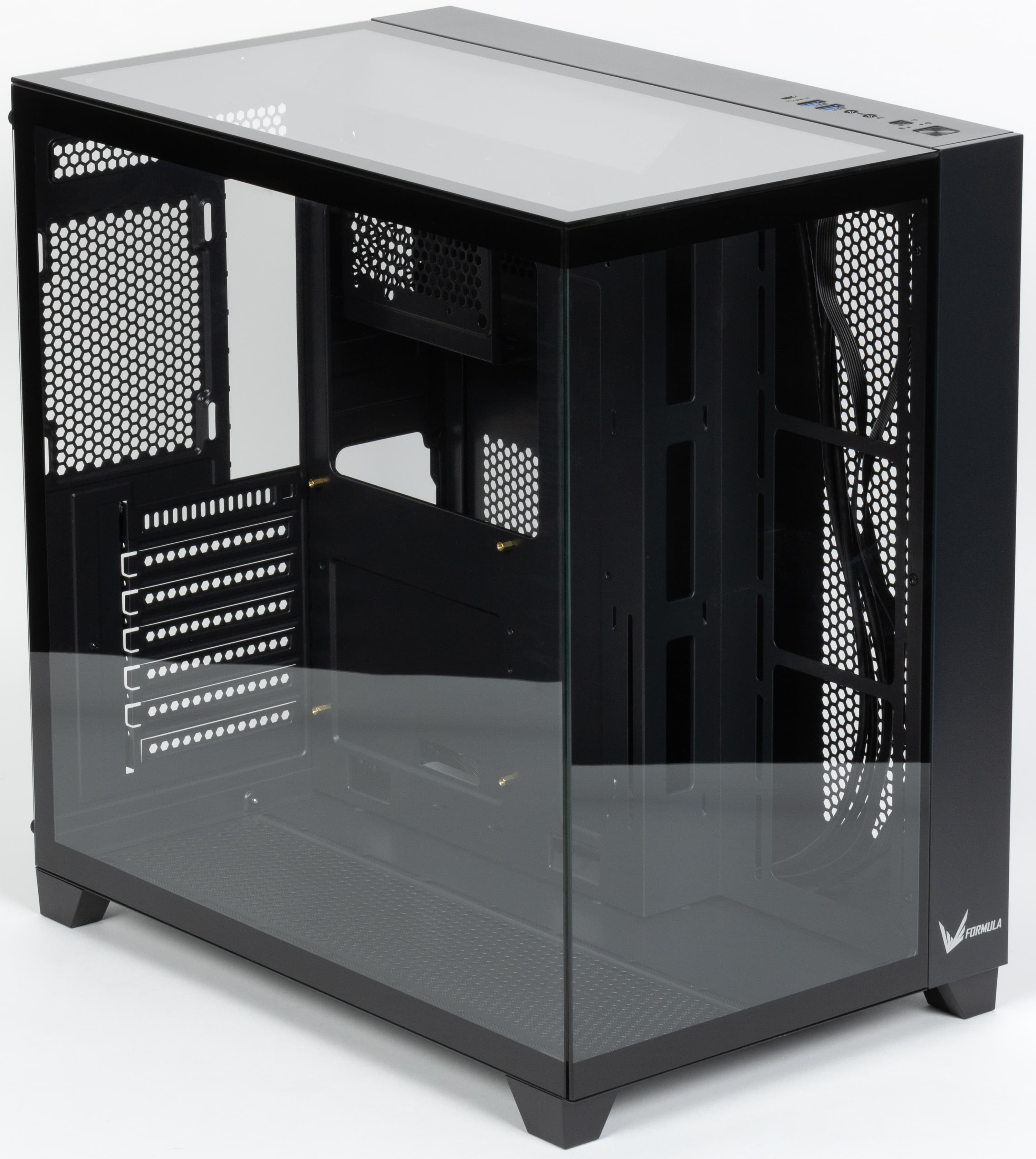 Какие-то декоративные панели или иные средства, позволяющие скрыть от взгляда через три стеклянные поверхности отходящие от системной платы провода и кабели, не предусмотрены, и тут сборщику придется проявить фантазию, чтобы сделать всё красиво.