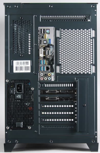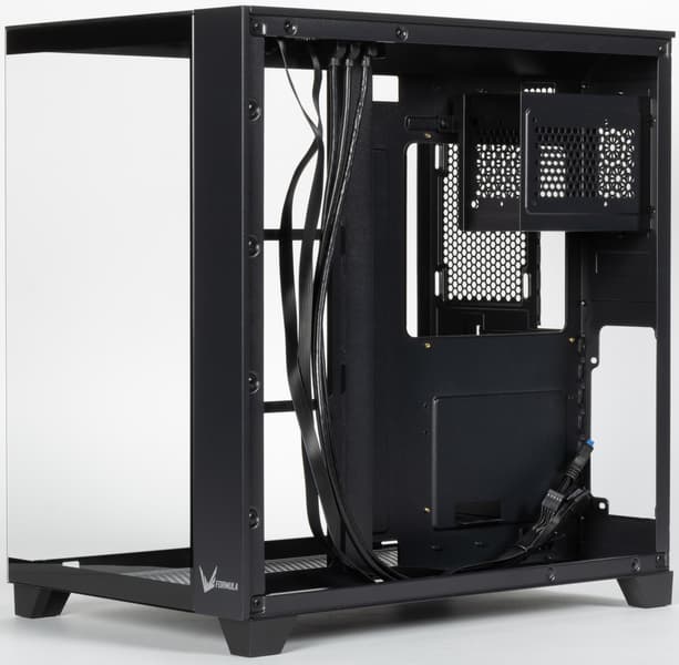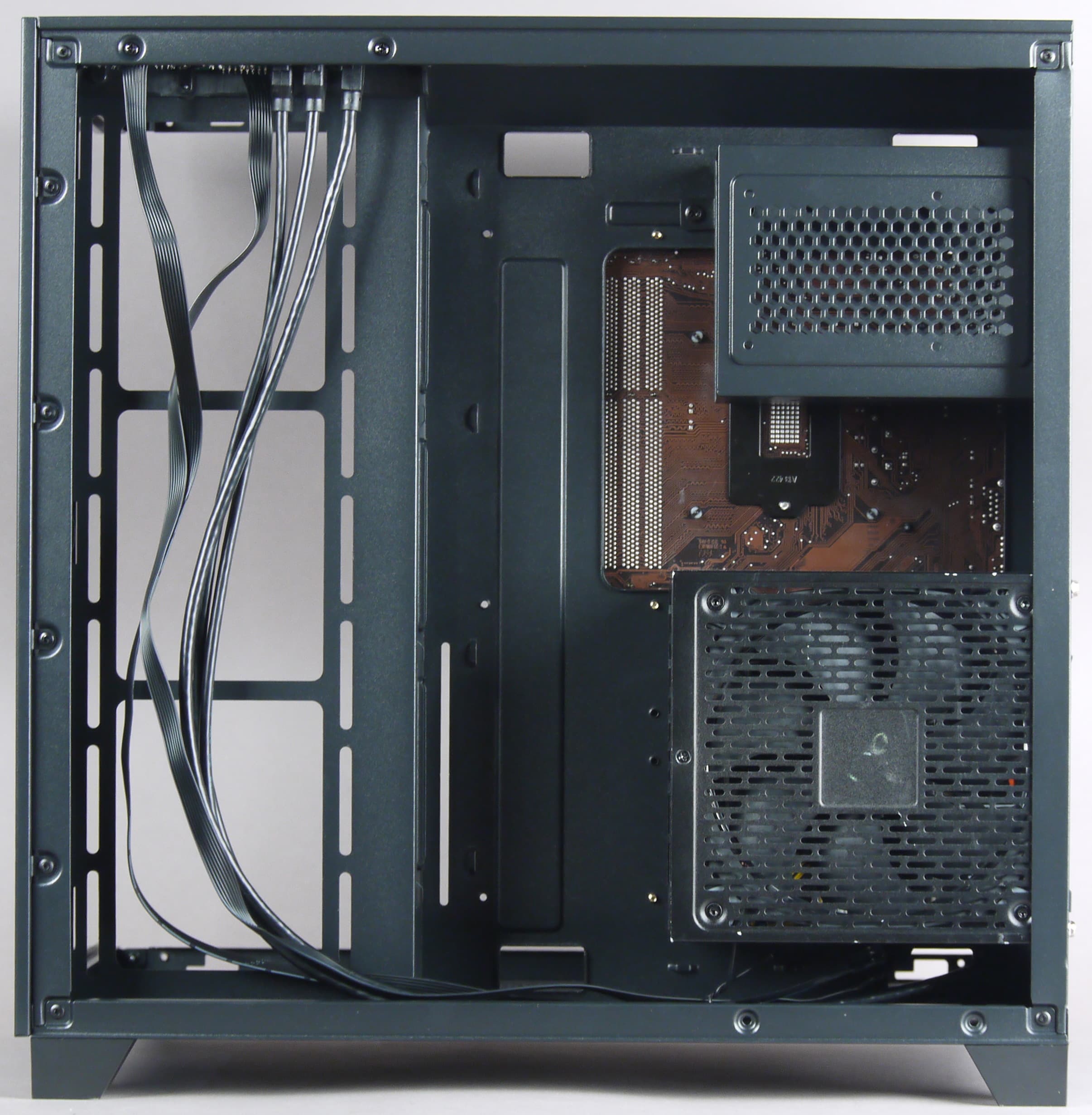 В левой части вертикально размещается системная плата форматом до ATX включительно с платами расширения, в правом вертикально устанавливается блок питания, там же находятся места для установки HDD/SSD.