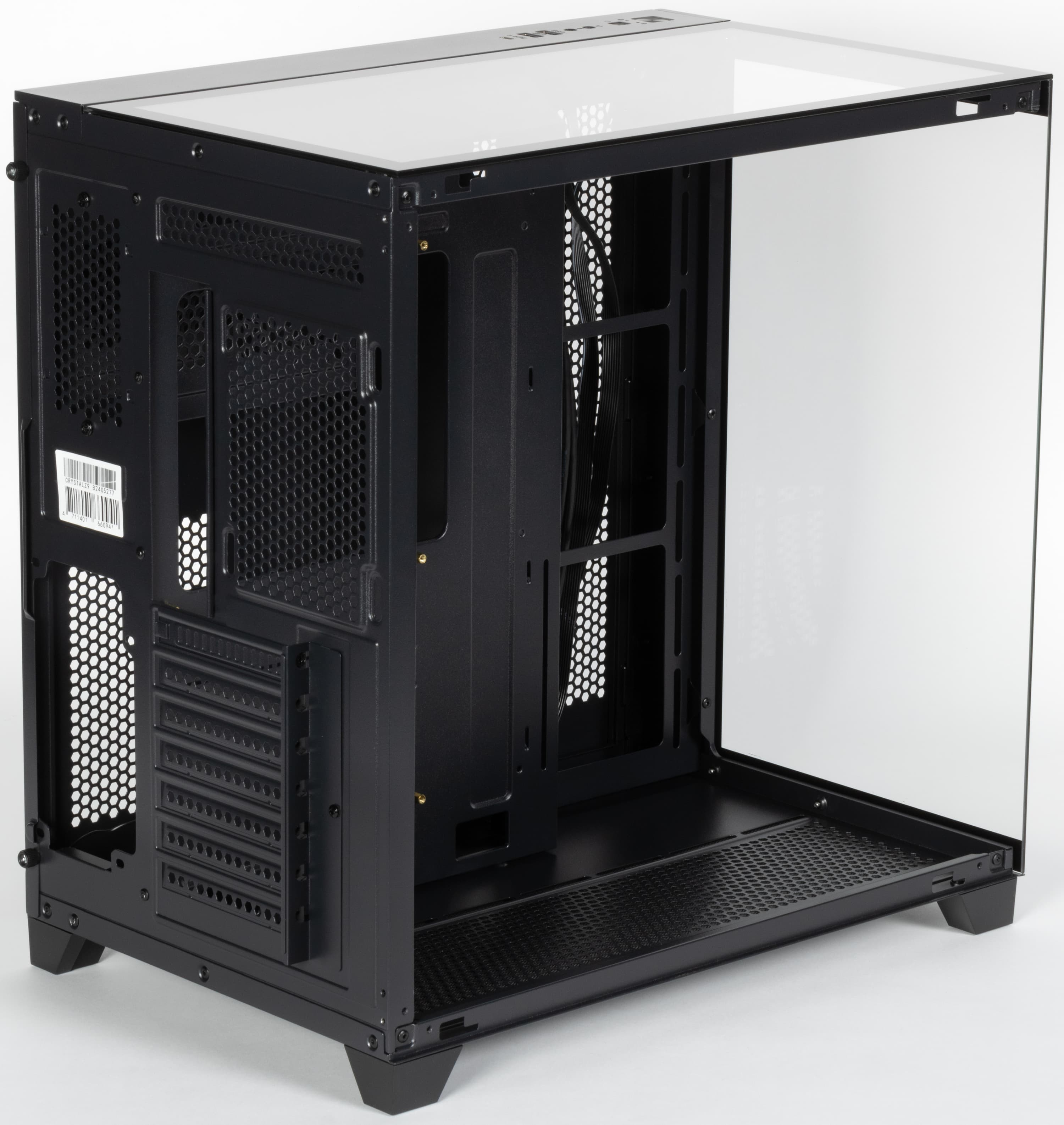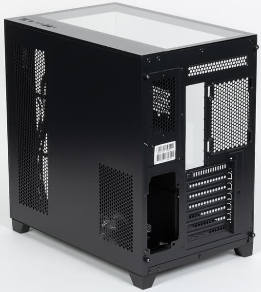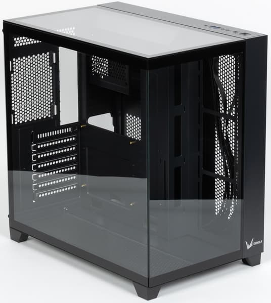 Все поверхности корпуса плоские с прямыми углами — подобное встречается сплошь и рядом, необычным является «остекление»: если подавляющее большинство корпусов сегодня оснащается одной прозрачной стенкой — левой боковой, то здесь из слегка тонированного закаленного стекла сделаны еще две поверхности: фронтальная и верхняя (правда, не целиком: правые их части примерно на 20% ширины металлические).