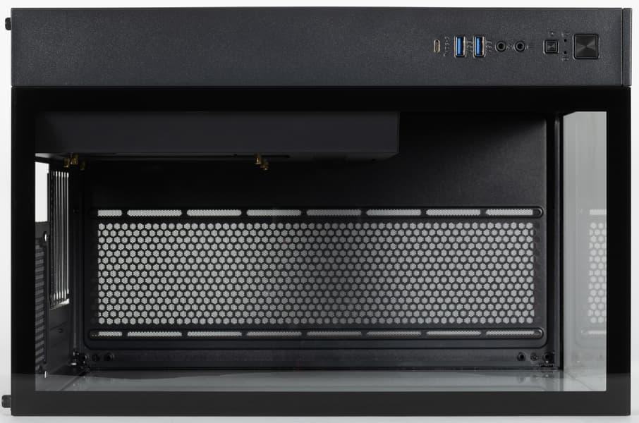 Интерфейсные разъемы и кнопки расположены в правой части верхней плоскости шасси ближе к лицевой панели. Имеются два порта USB Type-A и один USB Type-C (конечно, тех и других хотелось бы иметь побольше, но для корпуса с умеренной ценой и это вполне нормально), отдельные разъемы для подключения микрофона и наушников, два индикатора — включения и дисковой активности, небольшая кнопка перезагрузки, а также кнопка большего размера для включения. Усилие нажатия кнопок комфортное, свободный ход совсем небольшой, для Power нельзя исключить срабатывания от случайного прикосновения, а для Reset из-за ее размера подобное вряд ли возможно.