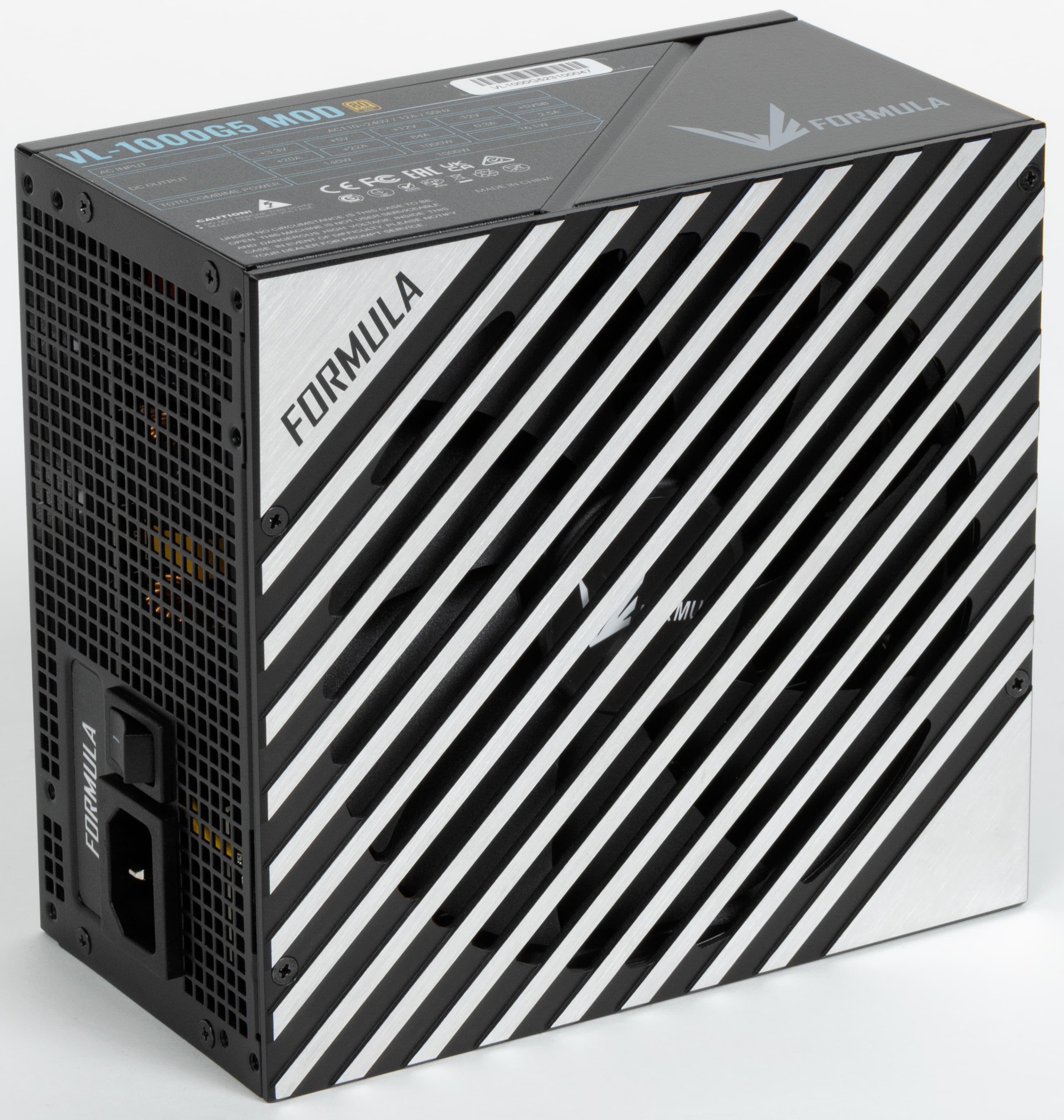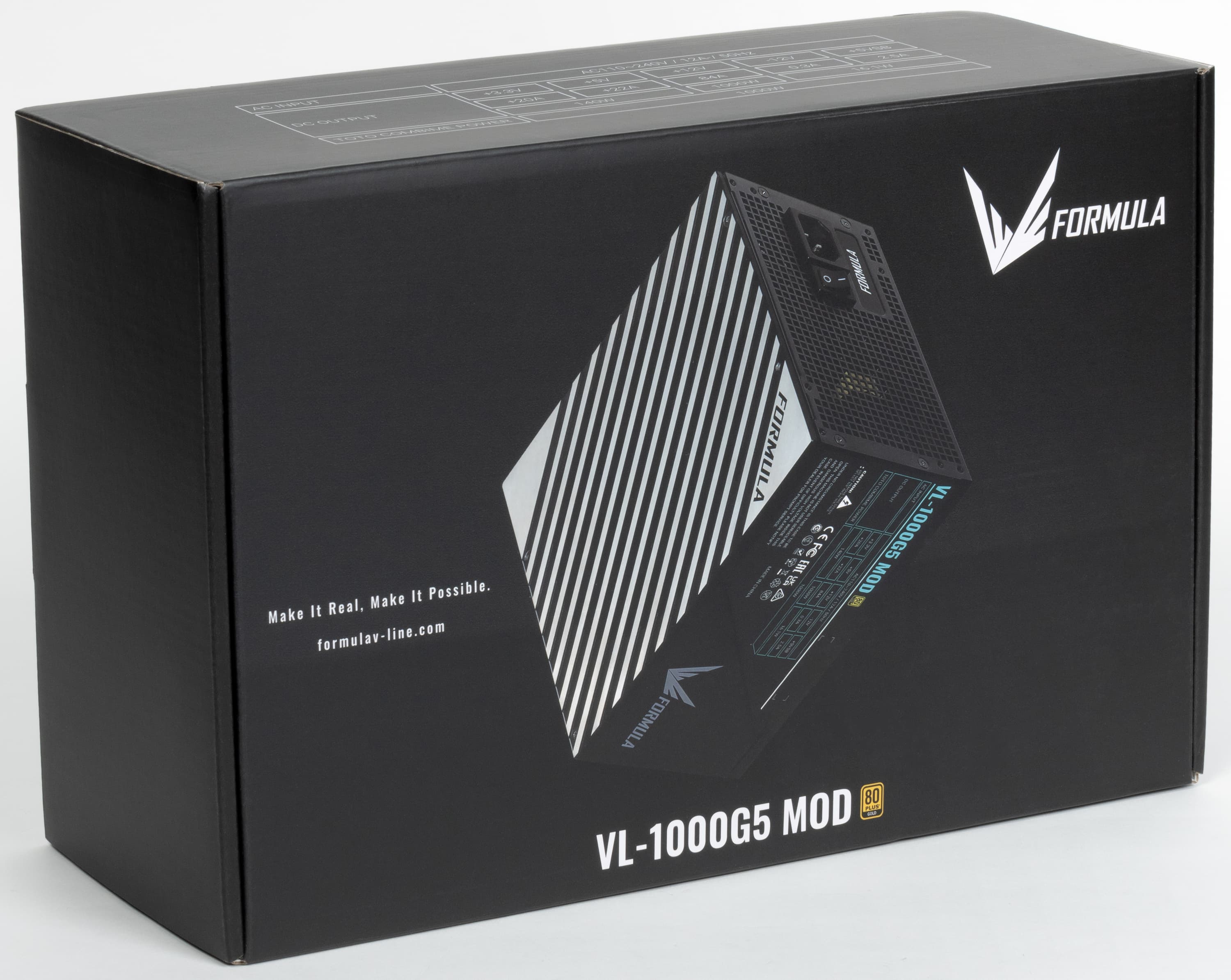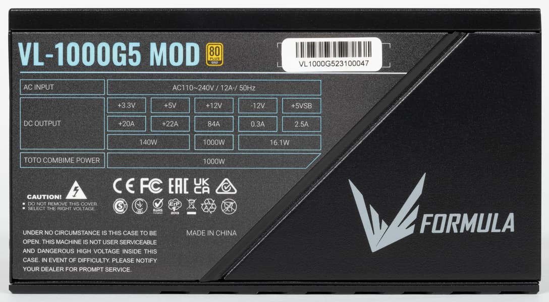 Блок питания имеет невразумительное, «каталожное» название Formula VL-1000G5-MOD. Он представляет собой источник питания с сертификатом 80Plus Gold. По нынешним временам это среднебюджетное решение — разумеется, для сегмента БП столь высокой мощности.