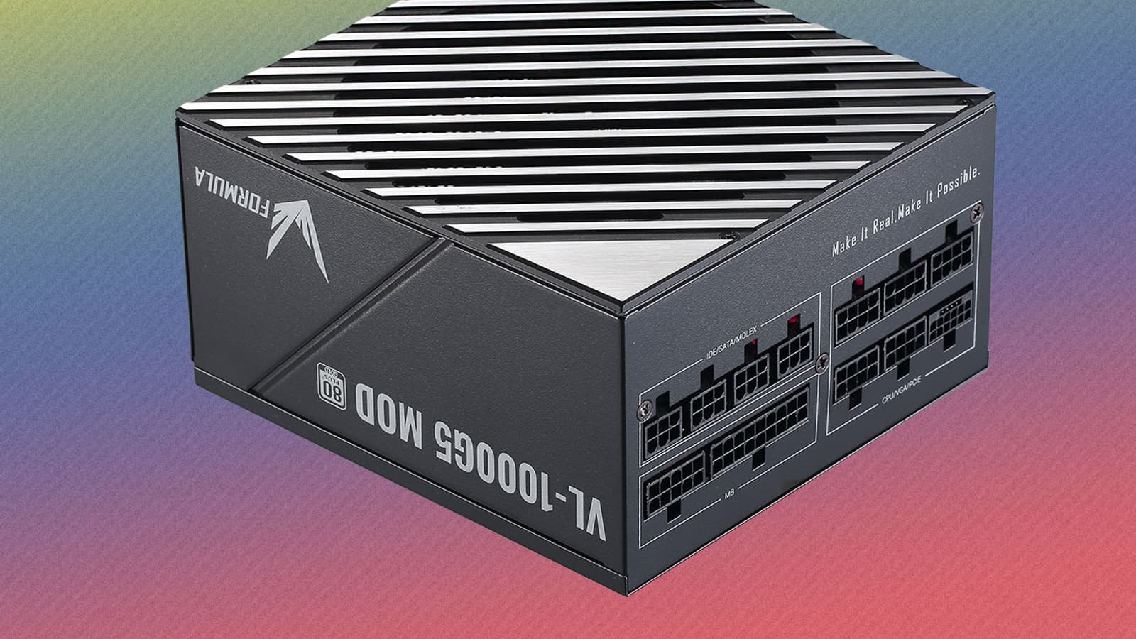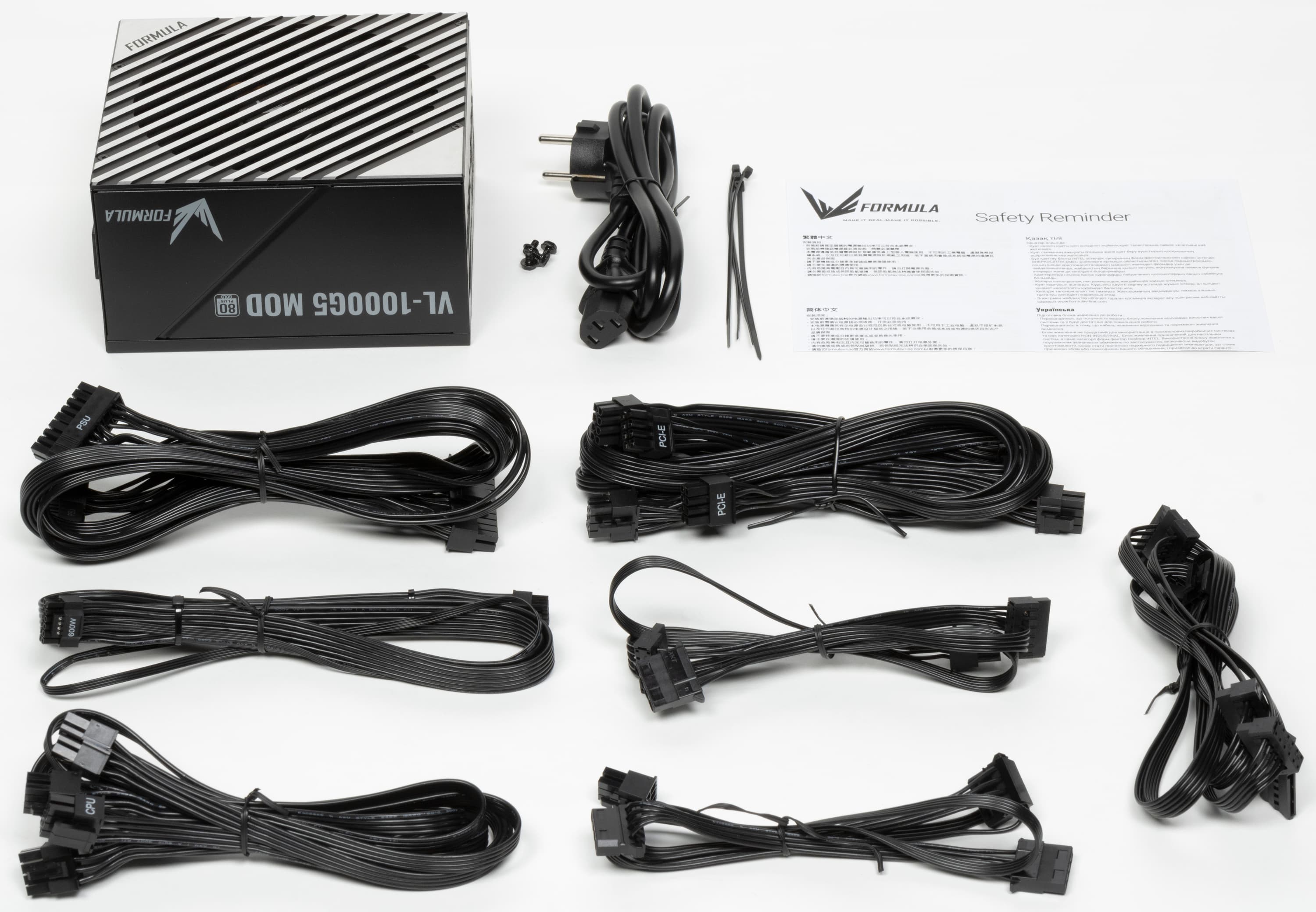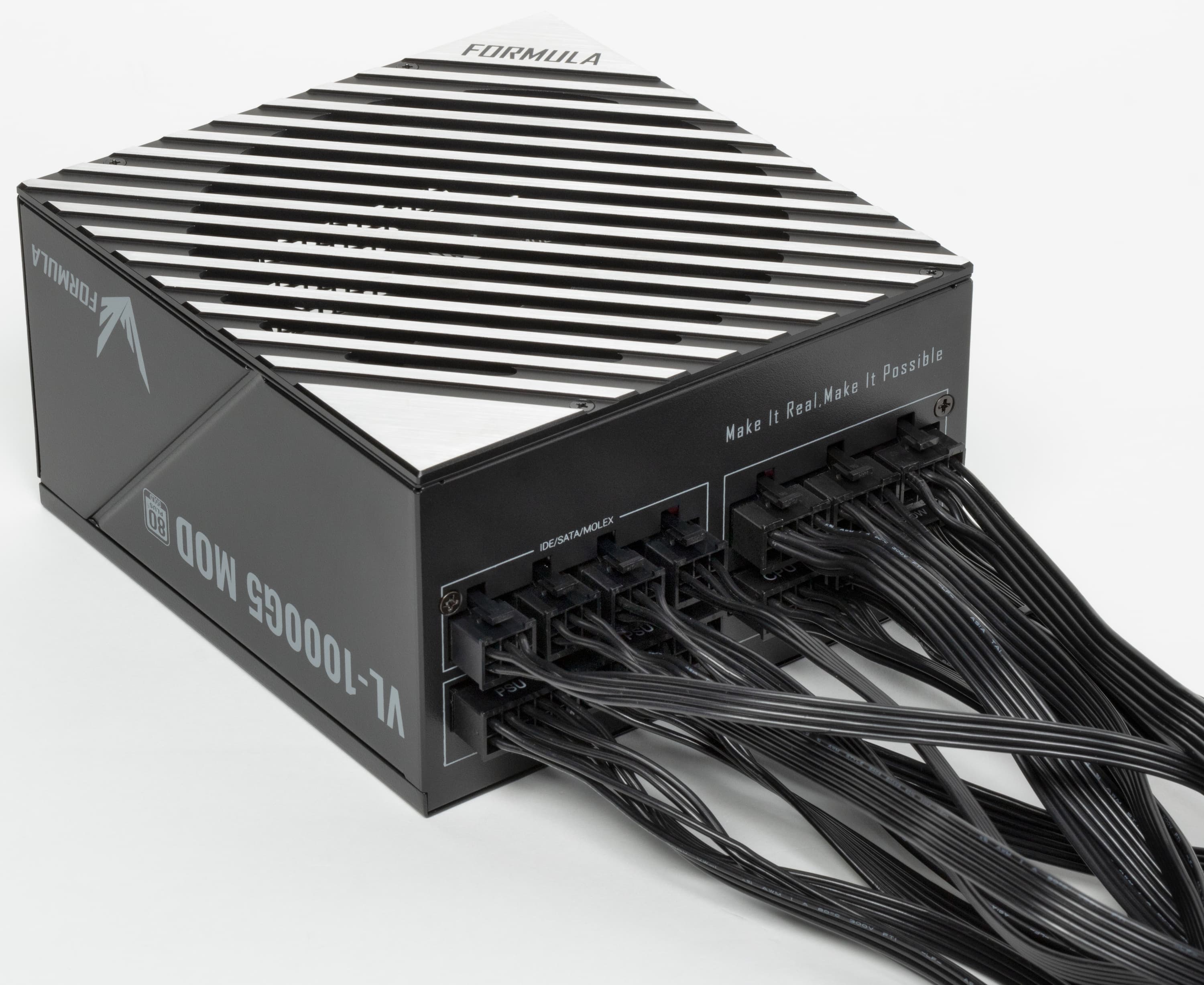 Блок питания имеет невразумительное, «каталожное» название Formula VL-1000G5-MOD. Он представляет собой источник питания с сертификатом 80Plus Gold. По нынешним временам это среднебюджетное решение — разумеется, для сегмента БП столь высокой мощности.