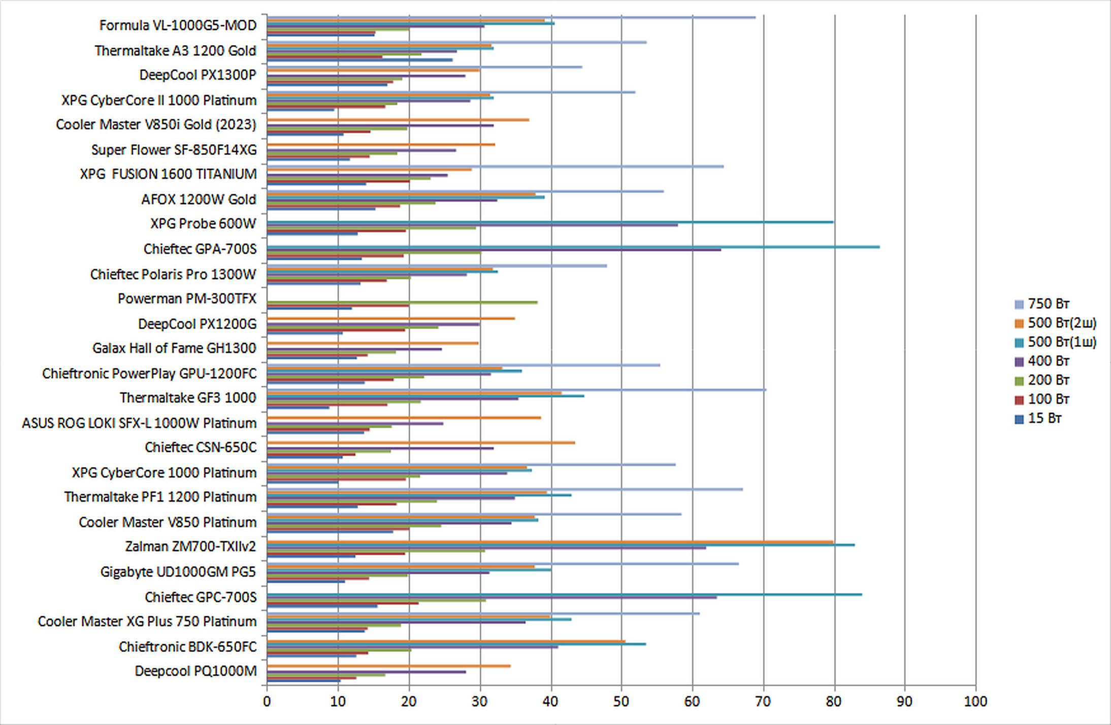 | Thermaltake GF1 1000 | 15,2 | 18,1 | 21,5 | 31,5 | 38,0 | 37,3 | 65,0 |