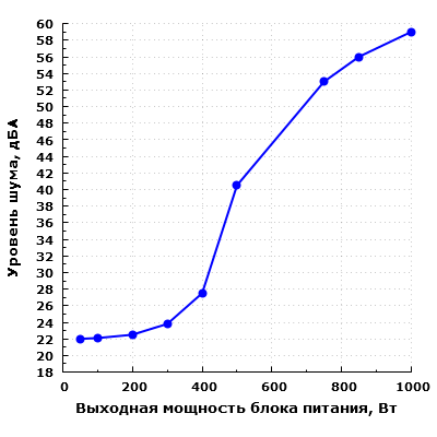 При работе на мощности 400 Вт шум блока питания находится на пониженном уровне для жилого помещения в дневное время суток — около 28 дБА с расстояния 0,35 метра.