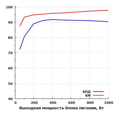 Всего таким образом мы измерили параметры блока питания в 9 точках. В результате максимальный КПД в нашем случае составил 91,8% при выходной мощности 400 Вт. Максимальная рассеиваемая мощность составила 106 Вт при выходной мощности 1000 Вт, что очень немного для блока питания подобной мощности.