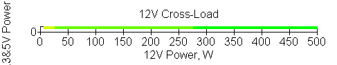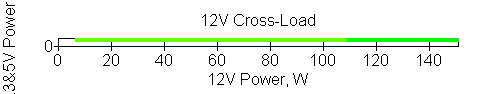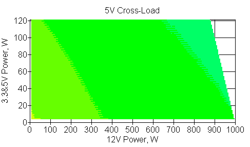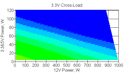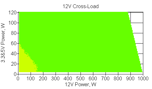 Следующим этапом инструментального тестирования является построение кросснагрузочной характеристики (КНХ) и представление ее на четвертьплоскости, ограниченной максимальной мощностью по шине 3,3&5 В с одной стороны (по оси ординат) и максимальной мощностью по шине 12 В с другой (по оси абсцисс). В каждой точке измеренное значение напряжения обозначается цветовым маркером в зависимости от отклонения от номинального значения.