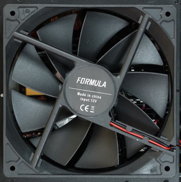В блоке питания установлен вентилятор, характеристики которого неизвестны. Можно предположить, что это вентилятор на подшипнике скольжения, т. е. самый дешевый вариант из возможных. Подключение вентилятора — двухпроводное, через разъем.