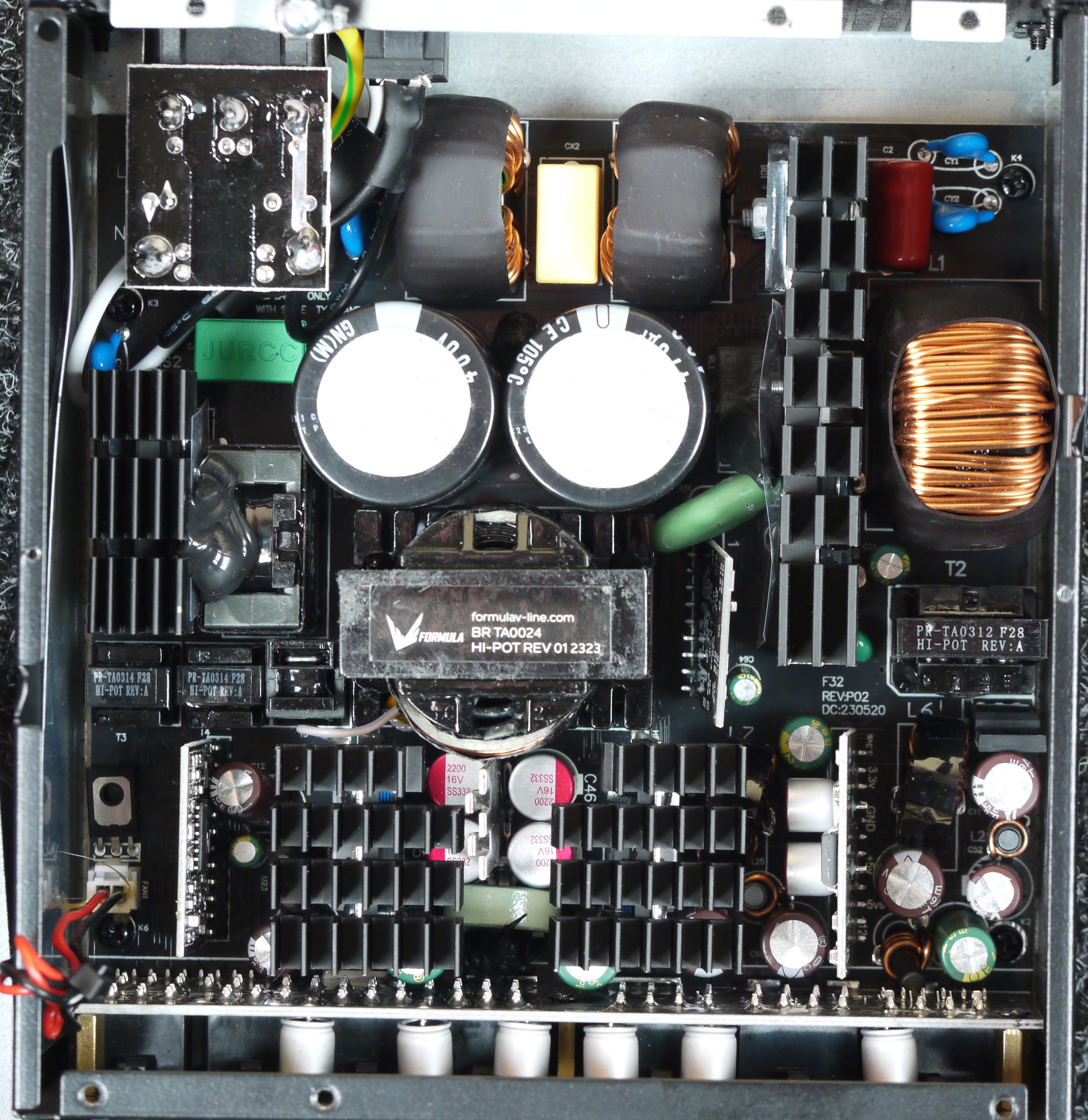 Конструкция блока питания вполне соответствует современным тенденциям: активный корректор коэффициента мощности, синхронный выпрямитель для канала +12VDC, независимые импульсные преобразователи постоянного тока для линий +3.3VDC и +5VDC.