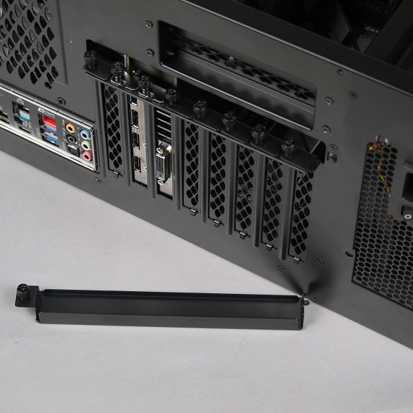 Крепление плат расширения в этом корпусе не самое удобное. Для установки двухслотовой видеокарты потребуется открутить не два и даже не три, а семь винтов, из которых три с накатной головкой: два держат съемные заглушки и еще один фиксирует дополнительную прижимную планку для этих же заглушек, а четыре — обычные винты, фиксирующие посадочное место для вертикально устанавливаемой видеокарты. Это посадочное место расположено поперек над стандартными отверстиями внутри корпуса, что заметно осложняет установку плат расширения.