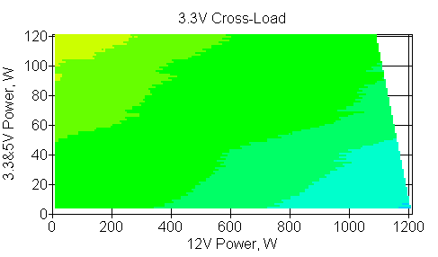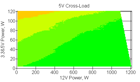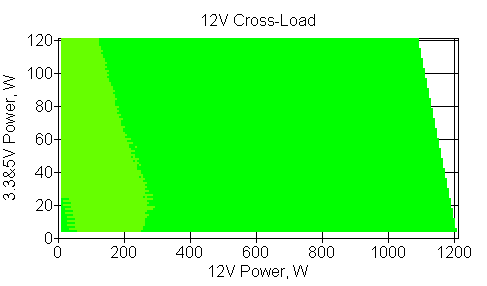 Следующим этапом инструментального тестирования является построение кросснагрузочной характеристики (КНХ) и представление ее на четвертьплоскости, ограниченной максимальной мощностью по шине 3,3&5 В с одной стороны (по оси ординат) и максимальной мощностью по шине 12 В с другой (по оси абсцисс). В каждой точке измеренное значение напряжения обозначается цветовым маркером в зависимости от отклонения от номинального значения.