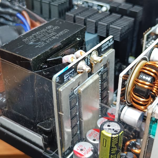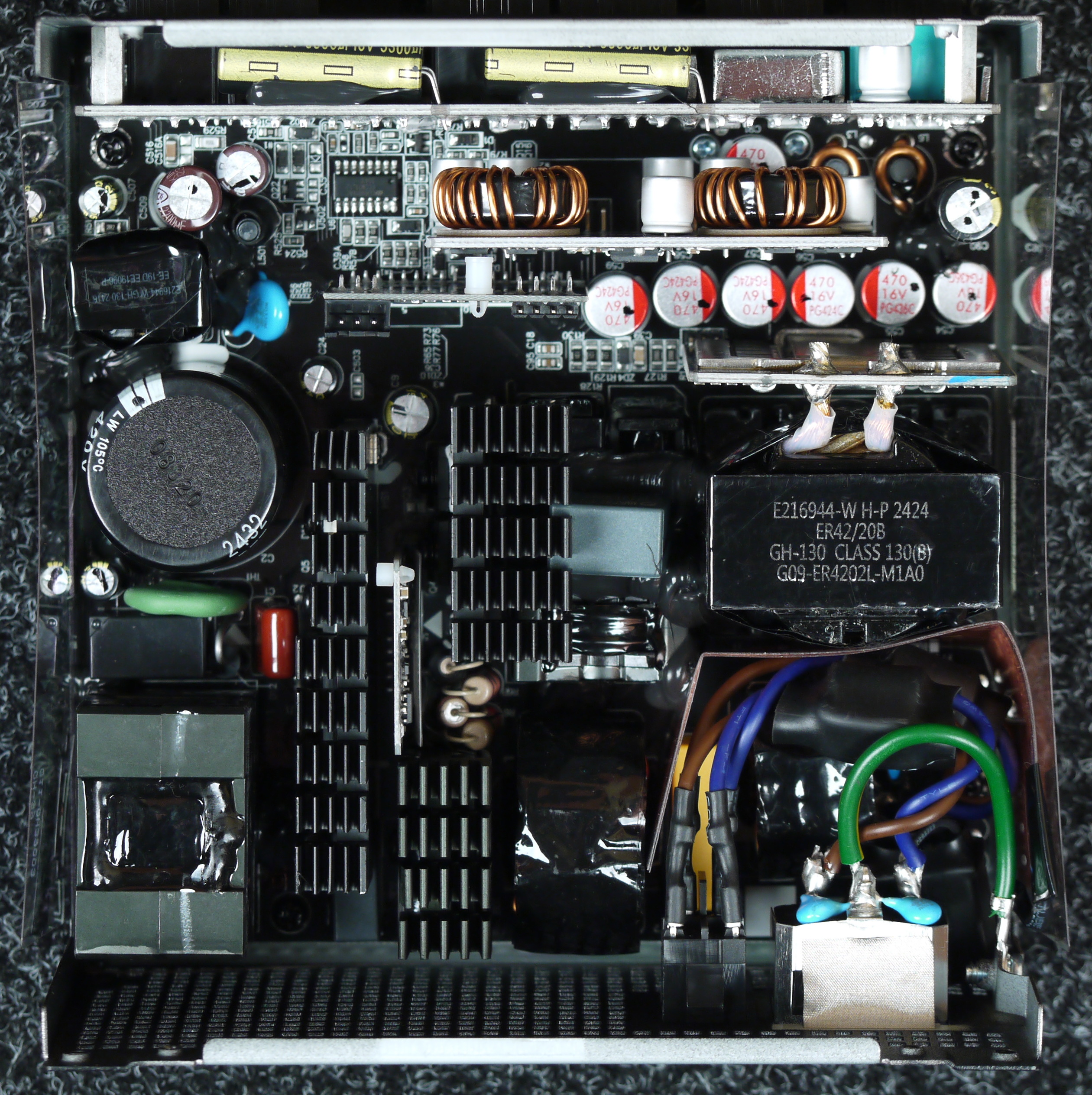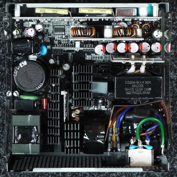 Полупроводниковые элементы высоковольтных цепей размещены на двух радиаторах, входной выпрямитель расположен на отдельном теплоотводе. Элементы синхронного выпрямителя размещены на дочерней плате, там же есть теплорассеивающие элементы.