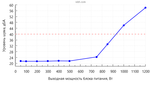 В диапазоне мощности до 500 Вт включительно шум блока питания находится на минимально заметном уровне для жилого помещения в дневное время суток.