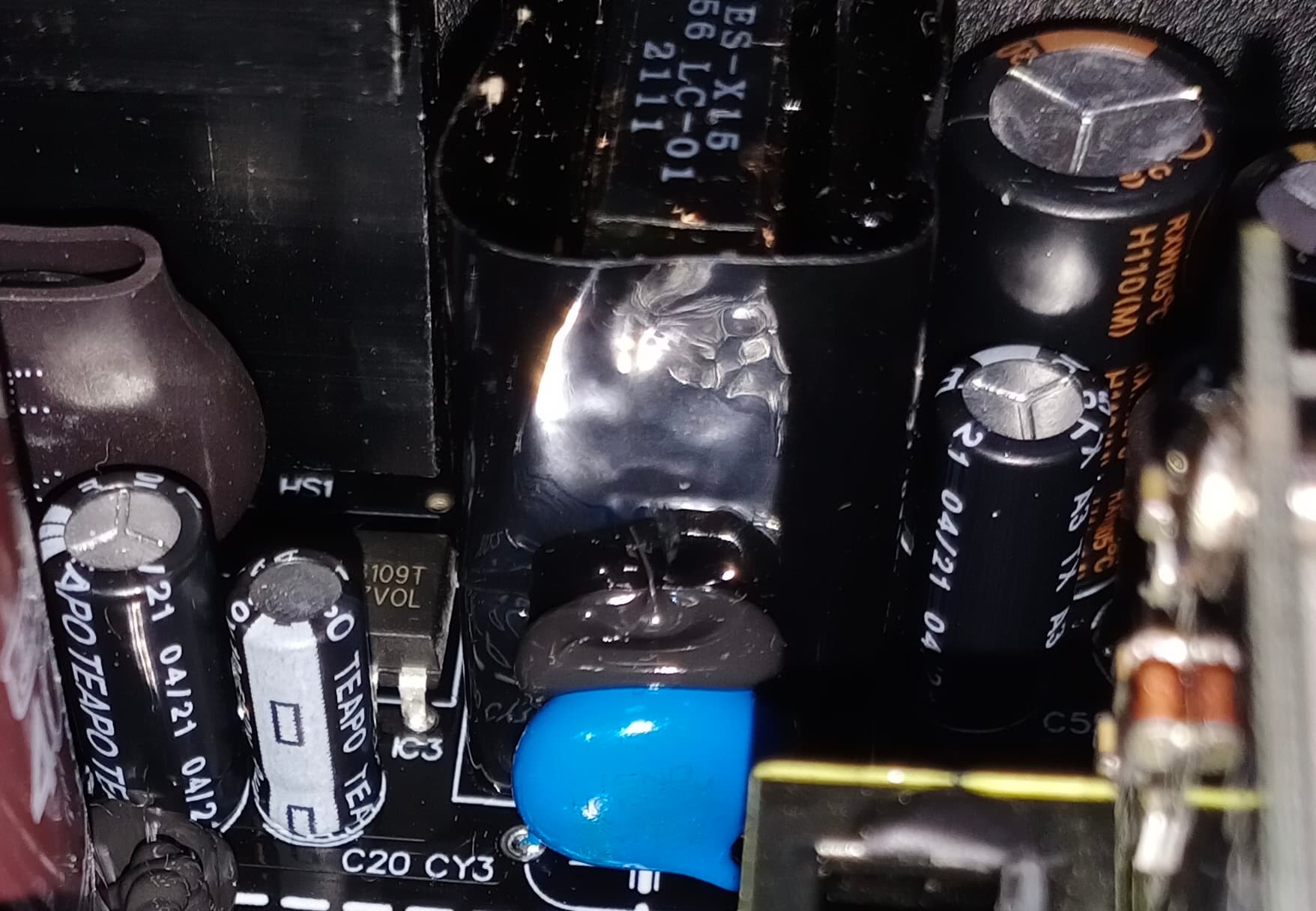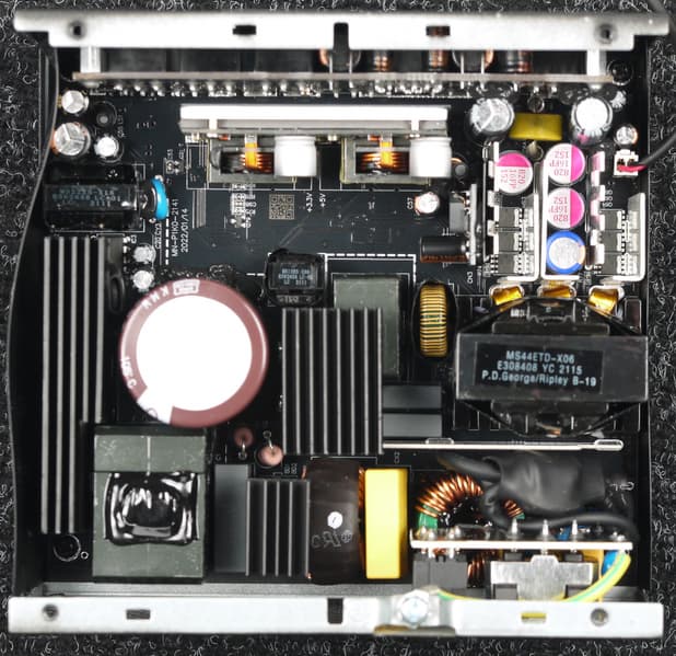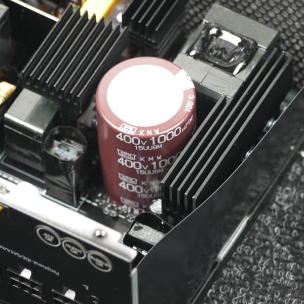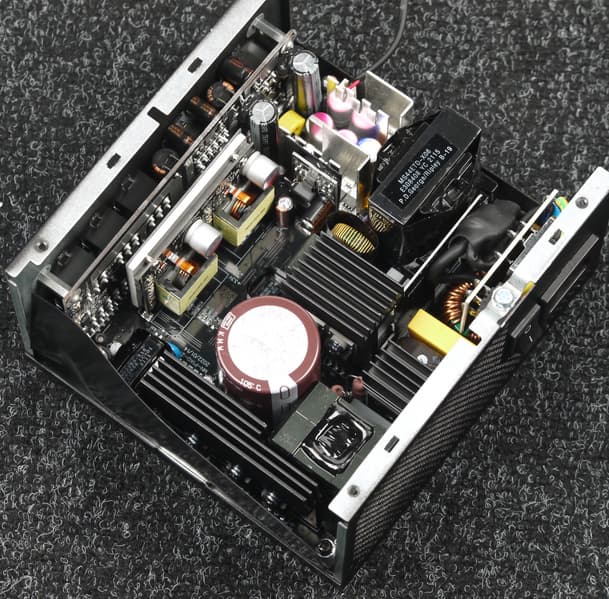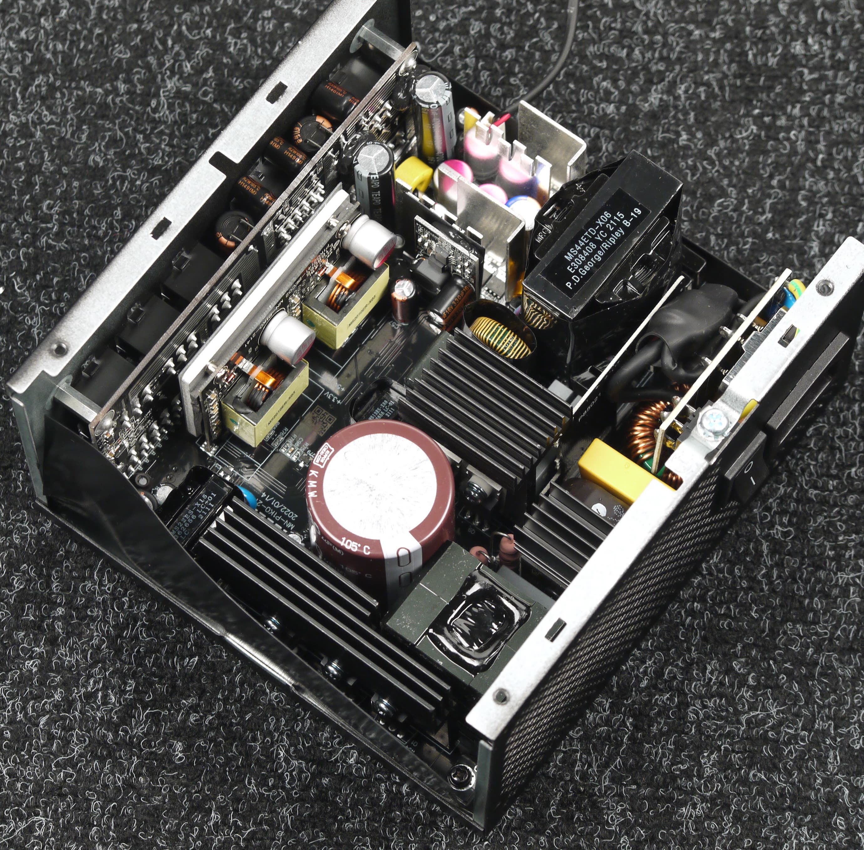 Высоковольтные силовые элементы установлены на нескольких радиаторах средних размеров, транзисторы синхронного выпрямителя установлены с лицевой стороны основной печатной платы, элементы импульсных преобразователей каналов +3.3VDC и +5VDC размещены на дочерней печатной плате, установленной вертикально, которая имеет весьма габаритный теплоотвод в виде пластины толщиной около 4 мм. Вокруг элементов выпрямителя также установлено несколько теплорассеивателей. Таким образом, разработчики хорошо подготовились к режиму работы с остановленным вентилятором.