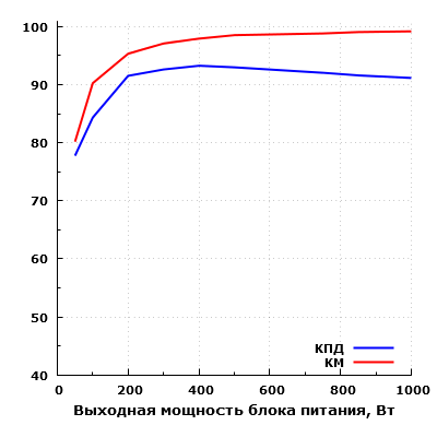 Представление эффективности компьютерного блока питания в виде значения КПД (коэффициента полезного действия) имеет свои традиции. Прежде всего, КПД — это коэффициент, определяемый соотношением мощностей на выходе и на входе блока питания, то есть КПД показывает эффективность преобразования электрической энергии. Обычному же пользователю данный параметр почти ничего не скажет, за исключением того, что более высокий КПД вроде как говорит о большей экономичности БП и более высоком его качестве. Зато КПД стал отличным маркетинговым якорем, особенно в комбинацией с сертификатом 80Plus. Однако с практической точки зрения КПД не оказывает заметного влияния на функционирование системного блока: он не увеличивает производительность, не снижает шум или температуру внутри системного блока. Это просто технический параметр, уровень которого в основном определяется развитием промышленности в текущий момент времени и себестоимостью продукта. Для пользователя же максимизация КПД выливается в увеличение розничной цены.