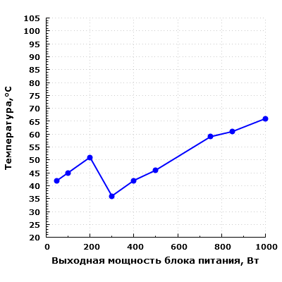 В результате тестирования было установлено, что вентилятор в блоке питания включается только при достижении пороговой мощности 260 Вт. Отключение вентилятора также происходит только при снижении мощности ниже порогового значения. Скачкообразного роста уровня шума при запуске вентилятора отмечено не было. Стоит учитывать, что в случае работы с остановленным вентилятором температура компонентов внутри БП сильно зависит от температуры окружающего воздуха. Блок питания способен долговременно работать с остановленным вентилятором на мощности 250 Вт и менее, температура внутри БП при этом находится на приемлемом уровне.