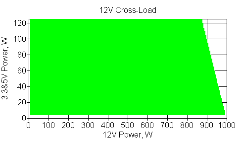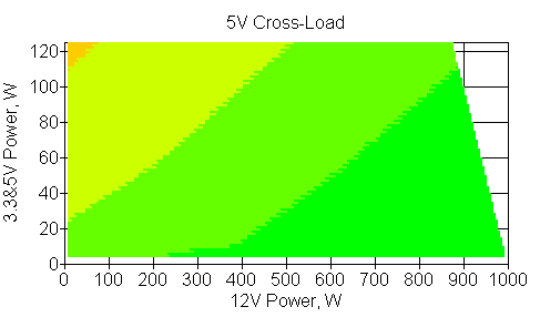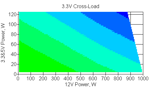 Следующим этапом инструментального тестирования является построение кросснагрузочной характеристики (КНХ) и представление ее на четвертьплоскости, ограниченной максимальной мощностью по шине 3,3&5 В с одной стороны (по оси ординат) и максимальной мощностью по шине 12 В с другой (по оси абсцисс). В каждой точке измеренное значение напряжения обозначается цветовым маркером в зависимости от отклонения от номинального значения.