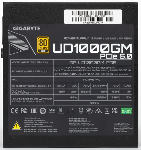 Все необходимые параметры указаны на корпусе блока питания в полном объеме, для мощности шины +12VDC заявлено значение 1000 Вт. Соотношение мощности по шине +12VDC и полной мощности составляет 1,0, что, разумеется, является отличным показателем. Стоит отметить, что линия разъема PCIe 5.0 (VHPWR) допускает максимальную нагрузку 55 А (660 Вт), а остальные линии 12 В — 83,3 А (999,6 Вт). В ходе тестовых испытаний БП разъем PCIe 5.0 не использовался.