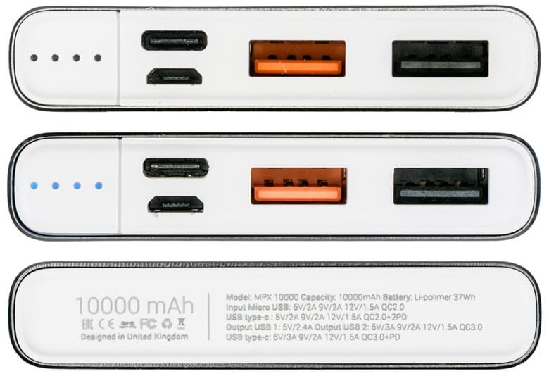 Надо заметить: на упаковке серебристых экземпляров MPX20000 и MPX10000 сказано о максимуме в 9 В / 2 А для QC и PD, а для серого упомянут еще и режим 12 В / 1,5 А (то же написано и на сайте производителя). И действительно: для серебристого пауэрбанка при зарядке в режиме QC не устанавливалось выше 9 В, а для серого был вполне доступен 12-вольтовый режим.