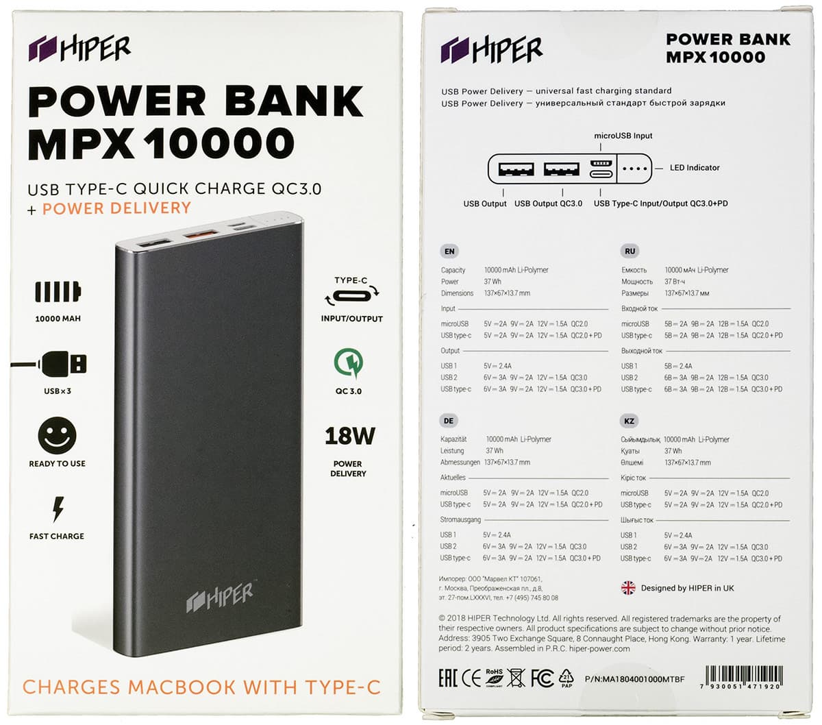 Компания Hiper производит самую разнообразную продукцию: блоки питания и корпуса для персональных компьютеров, различные аксессуары для мобильных устройств, очки виртуальной реальности, наушники и гарнитуры, портативную Bluetooth-акустику, а также целый спектр внешних аккумуляторов для питания мобильных гаджетов. Пару лет назад мы уже знакомились с пауэрбанками Hiper, причем в трех обзорах (часть 1, часть 2, часть 3). Конечно, за прошедшее время требования к таким устройствам изменились, и компания тоже не стои́т на месте, предлагая новые, современные модели — например, из серии MPX (но не только).