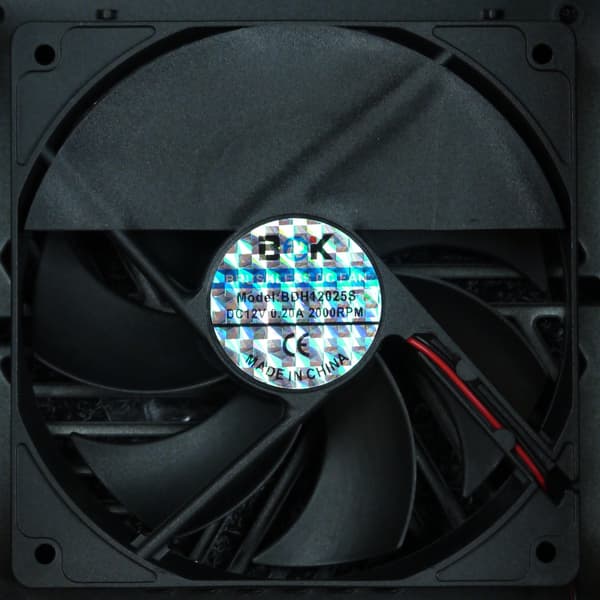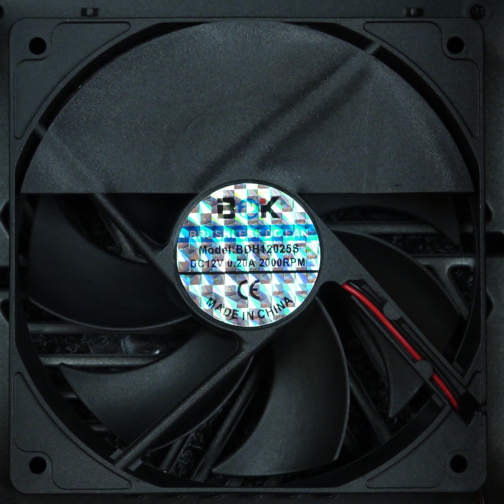 Под решеткой установлен вентилятор BDH12025S (2000 об/мин) типоразмера 120 мм, изготовленный компанией BOK. Вентилятор основан на подшипнике скольжения. На гарантийный срок подобных вентиляторов обычно хватает.