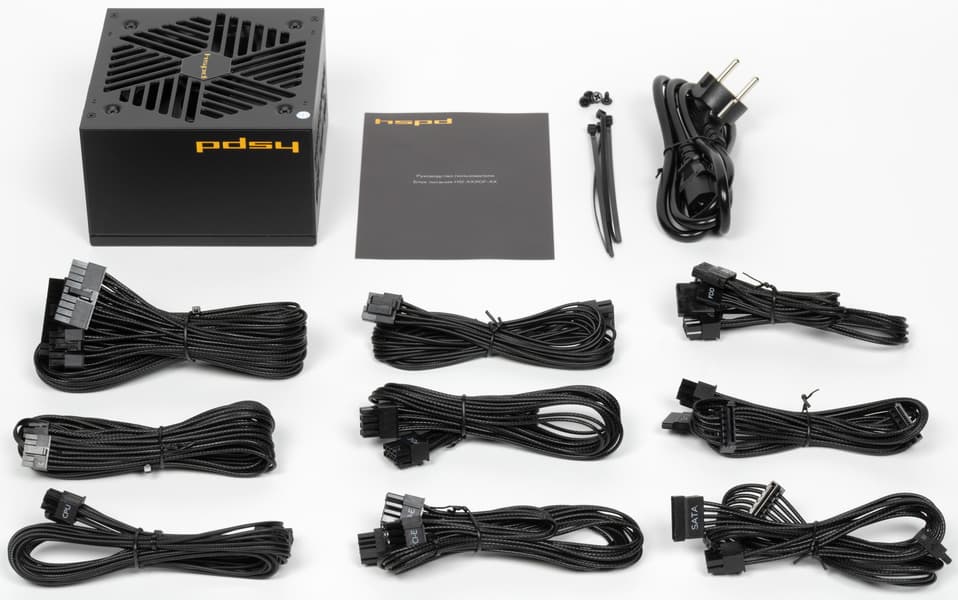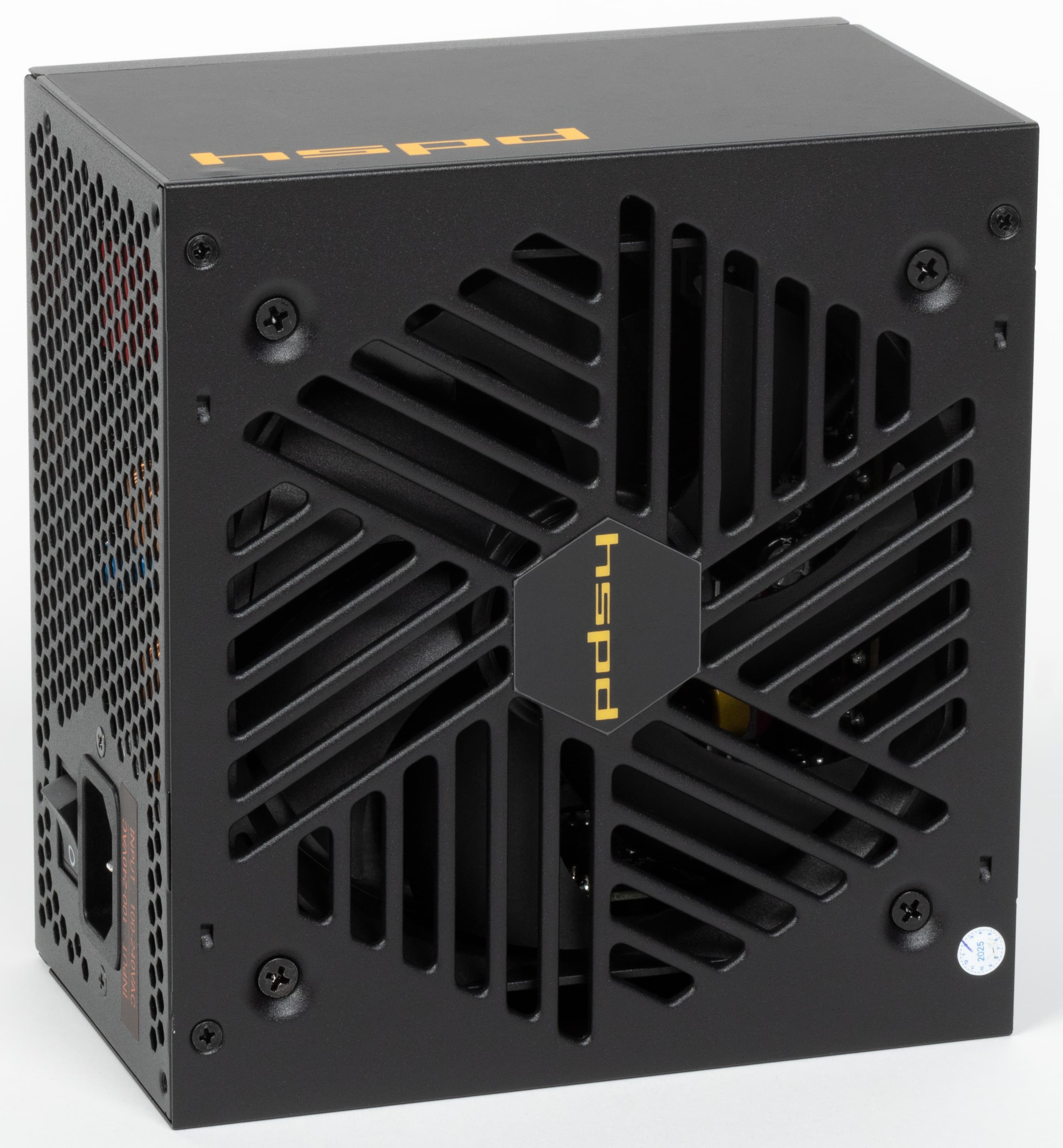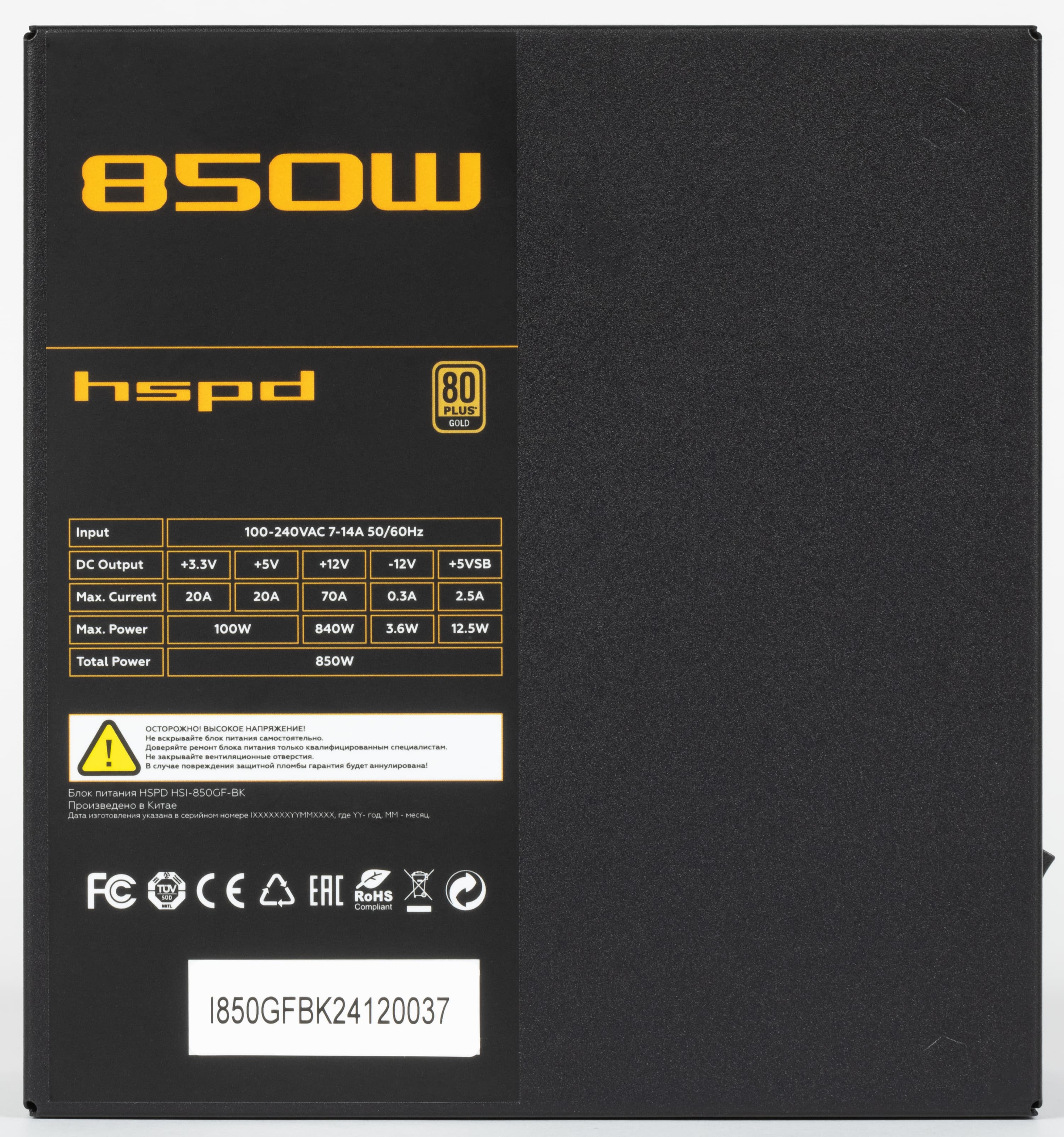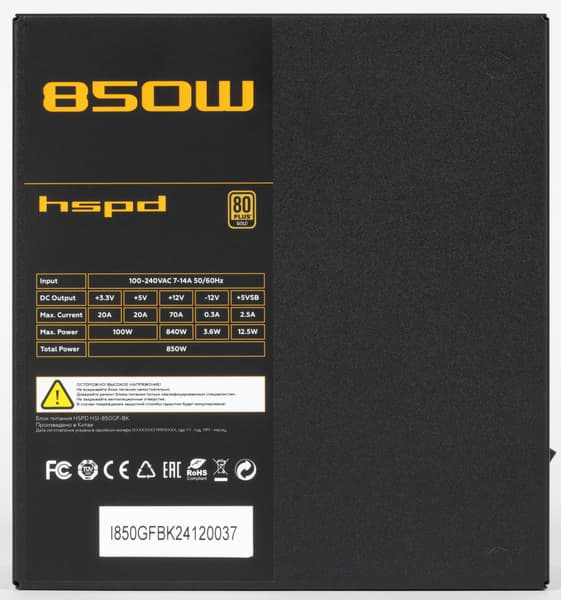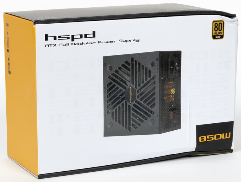 К нам на тестирование попал относительно недорогой БП под торговой маркой HSPD — HSI-850GF-BK. Это источник питания мощностью 850 Вт, кроме него в данной серии присутствуют модели мощностью 750 и 1000 Вт. Таким образом, в серии представлены решения высокой мощности. Все эти модели имеют сертификат 80Plus Gold, а также новый разъем питания для видеокарт PCIe 5.1 (12V-2×6). Стоимость данного БП на момент подготовки обзора составляла около 6500 рублей.