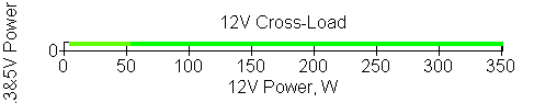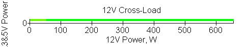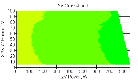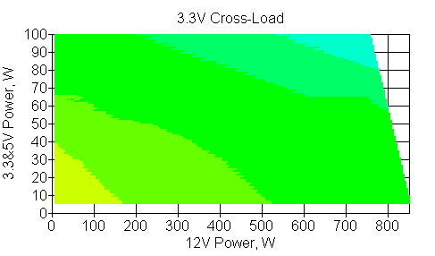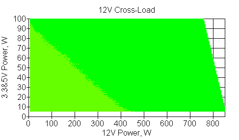 Следующим этапом инструментального тестирования является построение кросснагрузочной характеристики (КНХ) и представление ее на четвертьплоскости, ограниченной максимальной мощностью по шине 3,3&5 В с одной стороны (по оси ординат) и максимальной мощностью по шине 12 В с другой (по оси абсцисс). В каждой точке измеренное значение напряжения обозначается цветовым маркером в зависимости от отклонения от номинального значения.