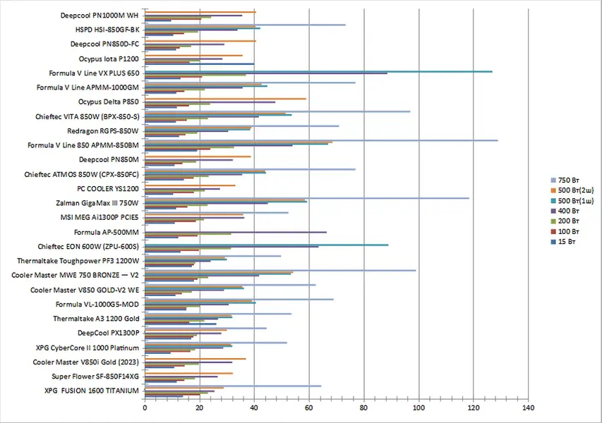 | Chieftec Atmos 850W (CPX-850FC) | 257 | 1033 | 1957 | 3816 | 4768 | 4765 | 7245 |