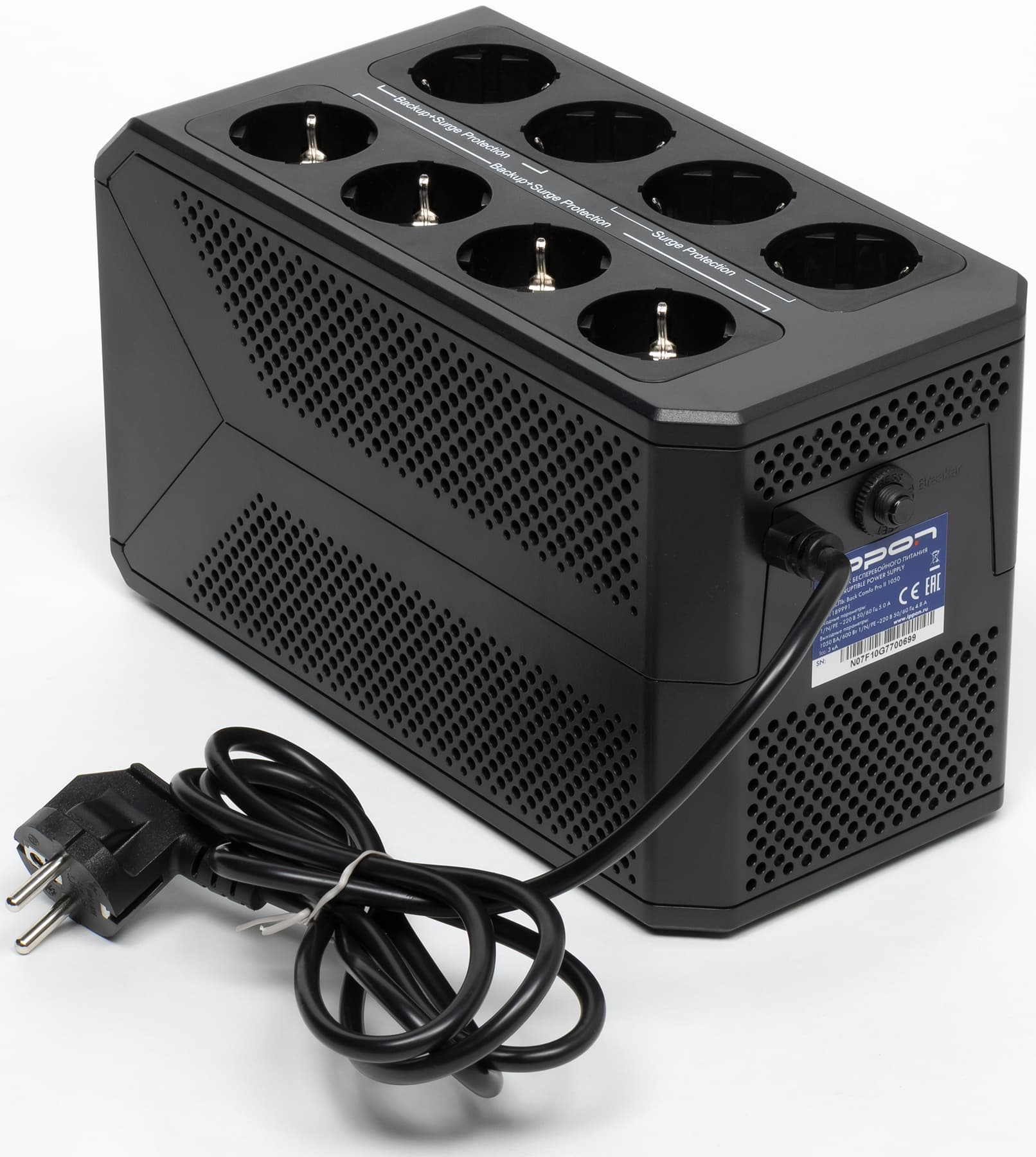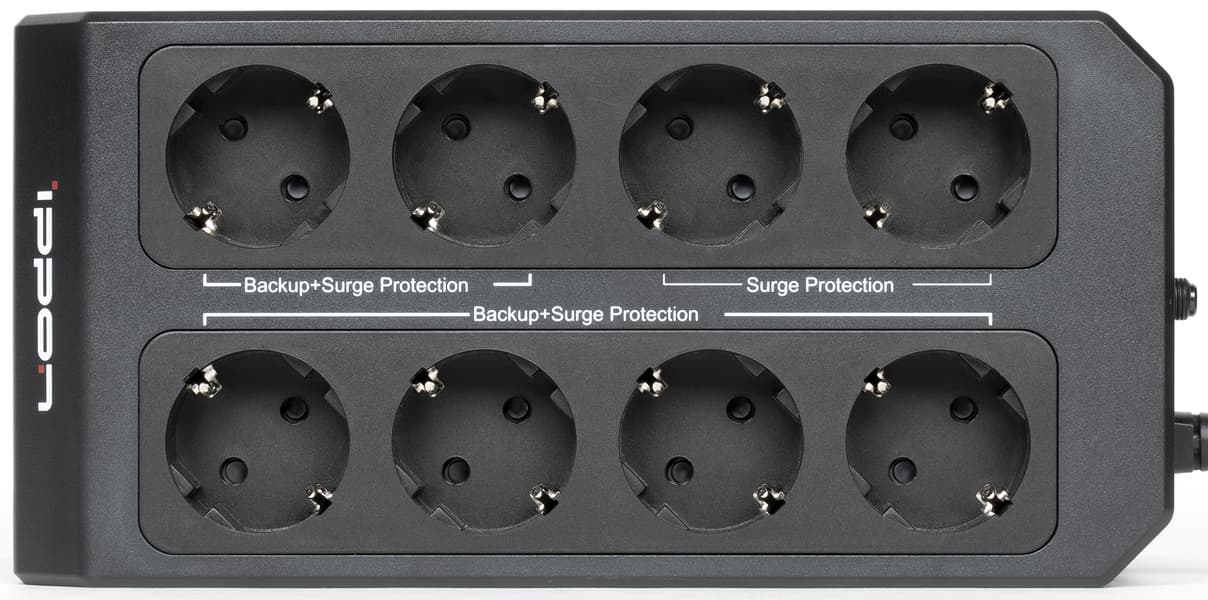 Количество выходных розеток у всех моделей линейки одинаковое: восемь типа CEE7/4 (или Schuko, с двумя боковыми плоскими контактами защитного заземления). Шесть из них подключены к инвертору/AVR и обеспечены бесперебойным питанием, еще две имеют только фильтрацию скачков напряжения в сети.