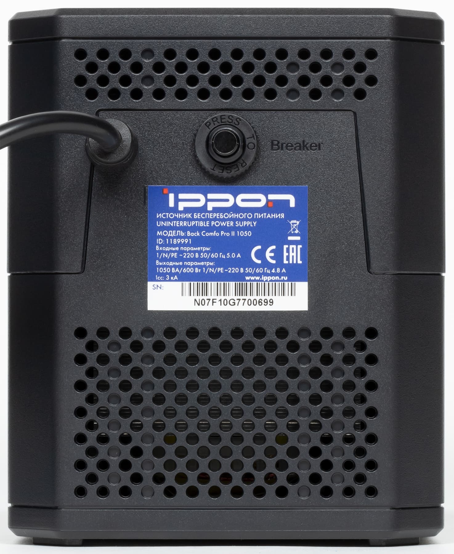 Соответственно задняя стенка практически пустая, из нее лишь выходит кабель для подключения к сети переменного тока (длина 1,6 м, отверстие снабжено защитой от перетирания), а еще имеется шток автоматического предохранителя и наклейка с информацией, включая серийный номер.
