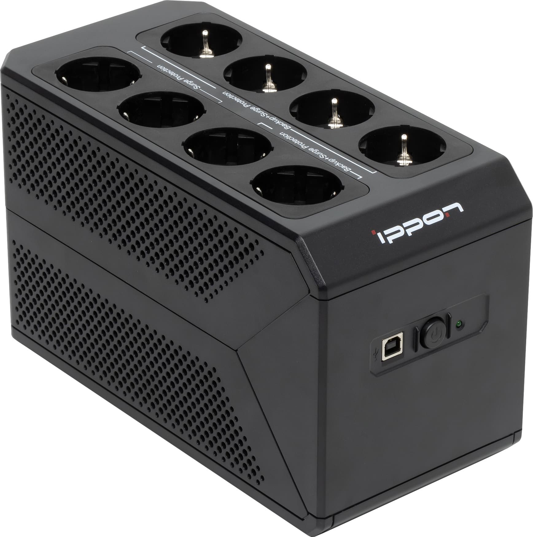 Выходные розетки расположены не сзади, как у большинства аналогов (включая и многие модели Ippon), а «на спине», то есть на верхней крышке. Это не уникальное решение, однако встречается относительно редко, хотя позволяет разместить существенно большее количество розеток, да и добираться до них удобнее как при настольной, так и при напольной установке источника.