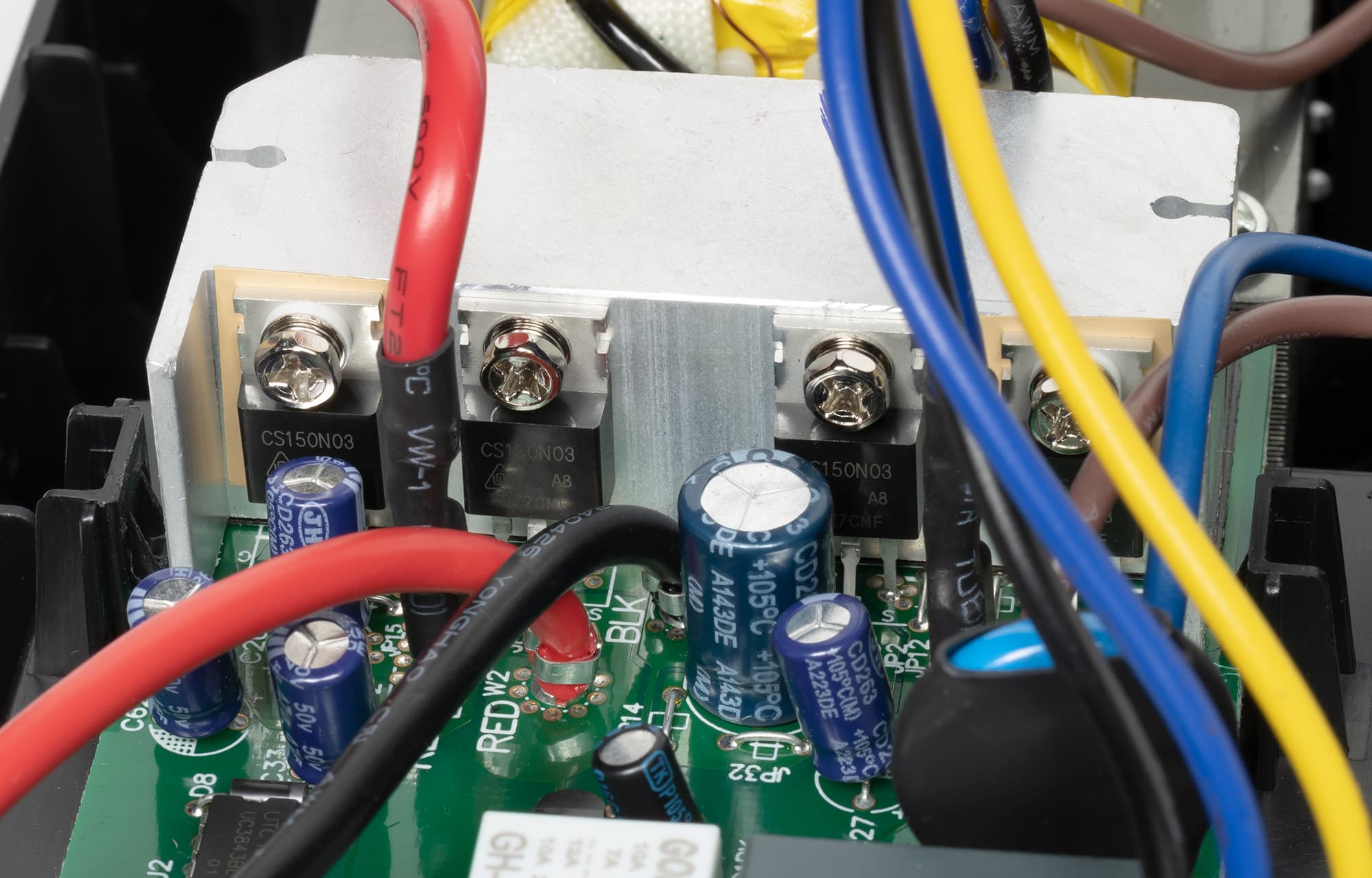 Инвертор выполнен на четырех МОП-транзисторах CS150N03, закрепленных на алюминиевом радиаторе в виде небольшого бруска без оребрения, но с боковыми выступами. Радиатор расположен рядом с трансформатором, то есть все нагревающиеся элементы сосредоточены в задней части источника.