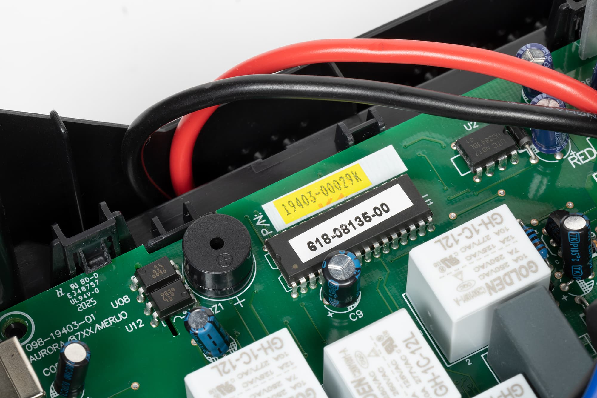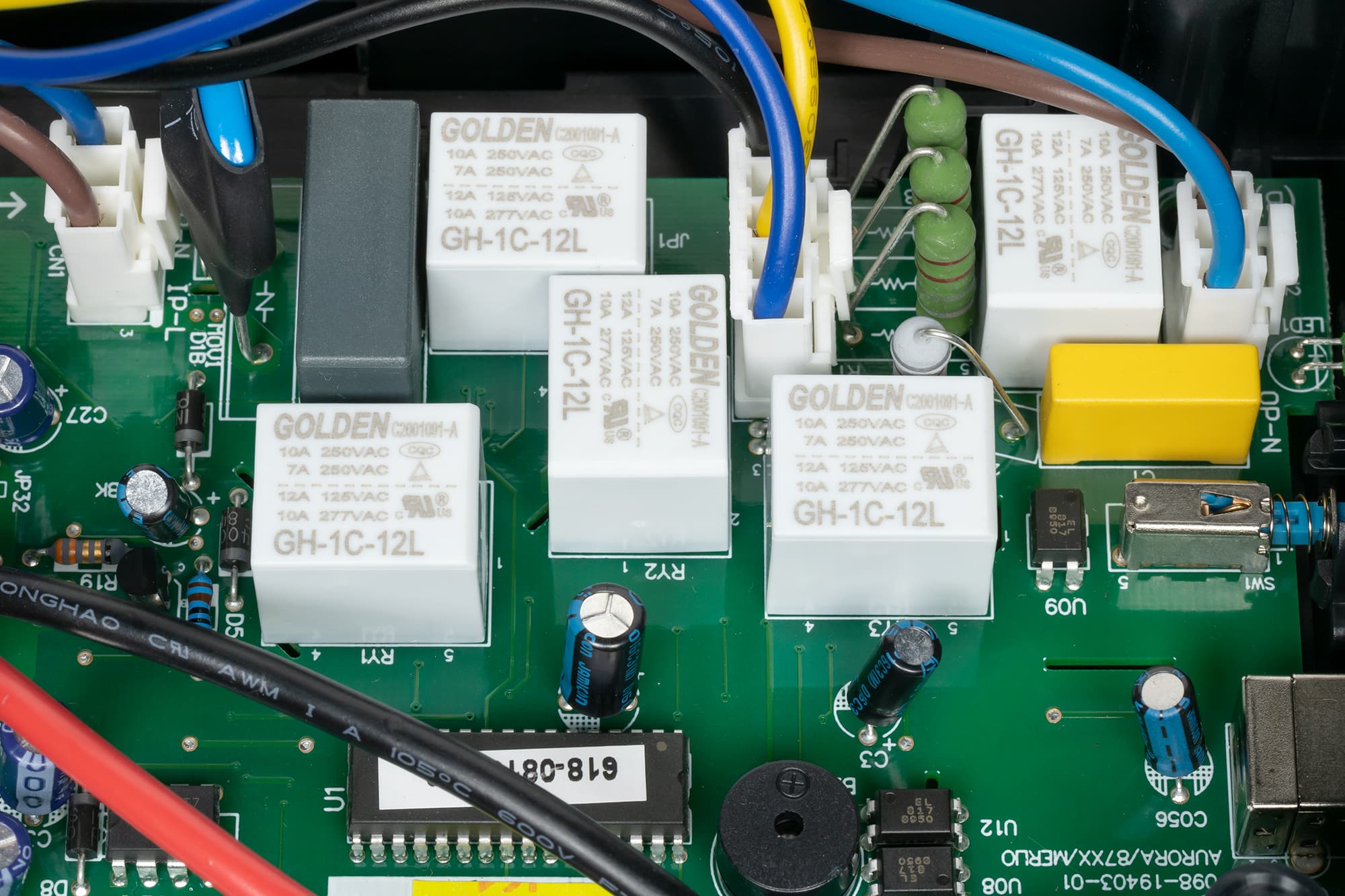 Коммутация осуществляется пятью реле Golden GH-1C-12L, защита от импульсных помех содержит варистор и конденсатор.