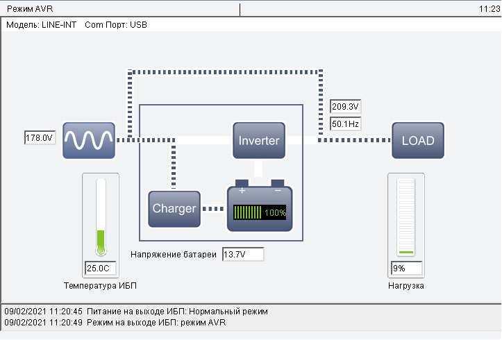 На схеме не учитывается срабатывание системы AVR, оно отображается лишь в виде текстового сообщения в нижней части окна. Переход на батарею приводит и к соответствующей смене «потоков энергии» на картинке, и даже если выключить ИБП кнопкой, оставив его подключенным к розетке, изображение тоже поменяется.