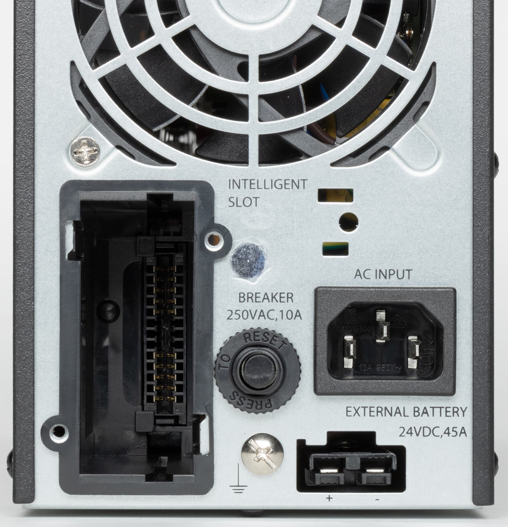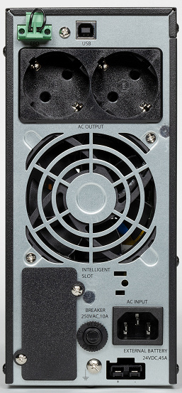 Центральную часть задней стенки занимает вентилятор, над ним расположены выходные розетки, коммуникационный порт USB-B для взаимодействия с компьютером и порт аварийного отключения EPO. Ниже находятся гнездо для подключения к внешней питающей сети (С14 у модели 1000L и C20 у 2000L), шток автоматического предохранителя и слот для опциональных карт. В самом низу располагается разъем для подключения батарей, а также винт для дополнительного заземления.