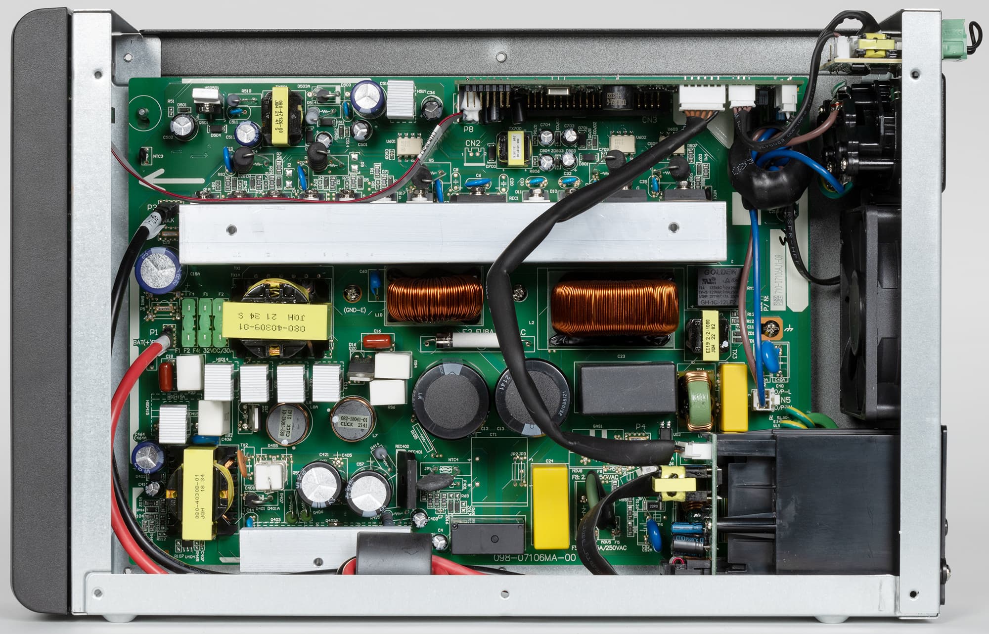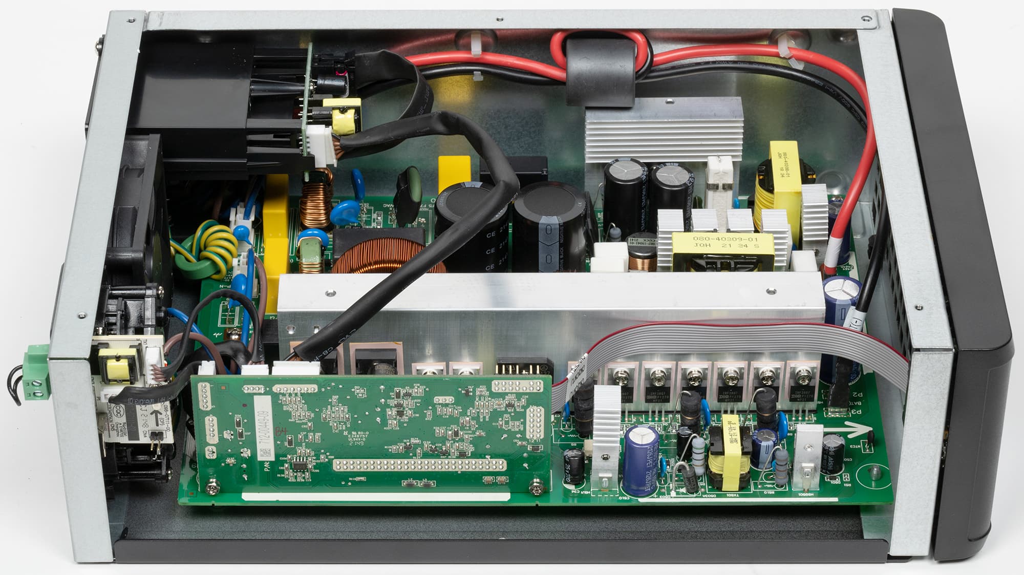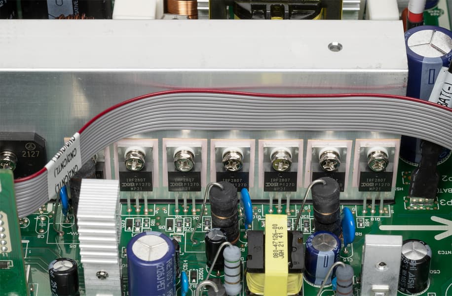 По характеру шум ровный, исключая лишь переходы от одной скорости к другой, привлекающих внимание или раздражающих призвуков нет. Тем не менее, работу рядом с источником комфортной не назовешь: на низкой скорости вентилятор работает всегда, на высокой — при наличии существенных нагрузок в линейном режиме, а при работе от батареи даже без нагрузки. Остается только гадать, откуда в описании появилась фраза про низкий уровень шума, пусть даже и при работе от сети: если сравнить с замерами для других подобных источников, значения получаются вполне сопоставимыми.