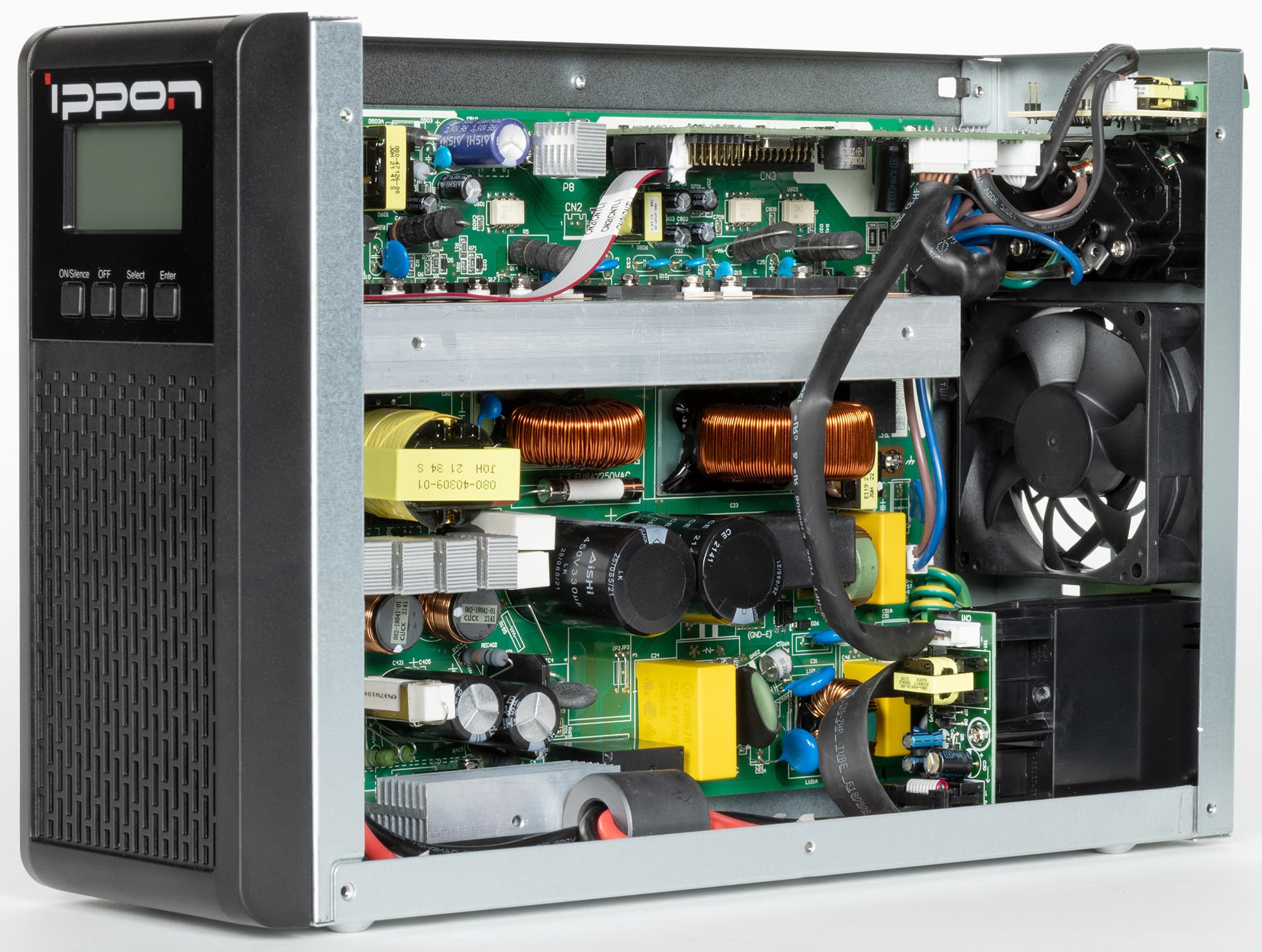 Линейка Ippon Innova G2 нам уже знакома, входящие в нее модели основаны на топологии двойного преобразования (On-line, «онлайн»), предусматривающей выпрямление входного переменного тока с последующим преобразованием снова в переменный, но уже с точно выдержанными параметрами (форма синусоиды, частота, напряжение). При этом отсутствует тяжелый и громоздкий низкочастотный трансформатор системы AVR, имеющийся в линейно-интерактивных ИБП, а длительность переходных процессов при переключениях на батарею или обратно равна нулю.