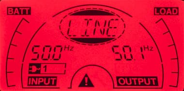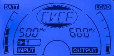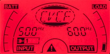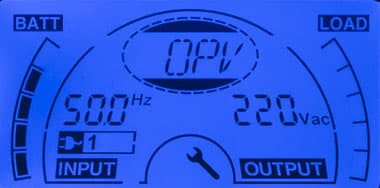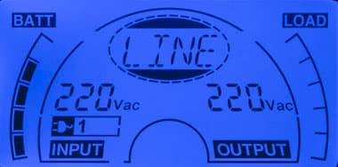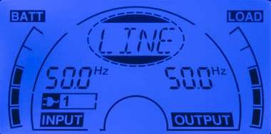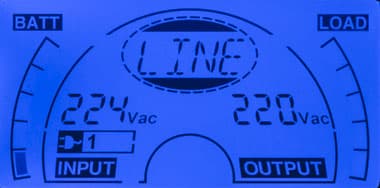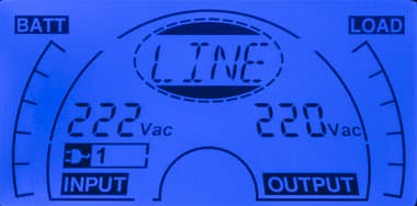 - цифрами — значения напряжения и частоты (выводятся попеременно) на входе и выходе, дополнительный значок показывает получение питания от внешней сети;