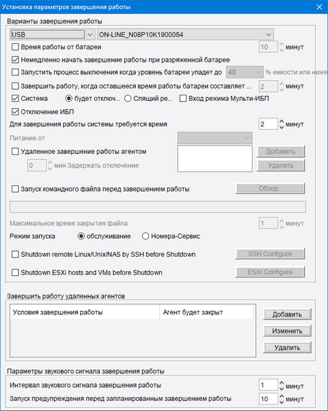 Доступны следующие установки (для вступления в силу некоторых может потребоваться перезапуск ИБП):