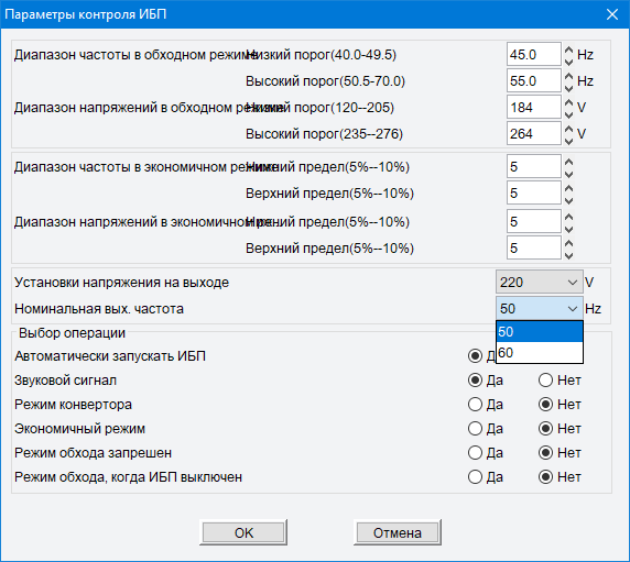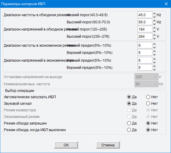 При выборе русского языка фразы кое-где налезают друг на друга, поэтому мы привели вариант и на английском, но вполне можно понять, что задаются условия работы в обходном режиме (байпас) — верхняя и нижняя границы по частоте и напряжению в герцах и вольтах, и то же самое для режима Eco, но уже почему-то в процентах (очевидно, от номинальных значений).