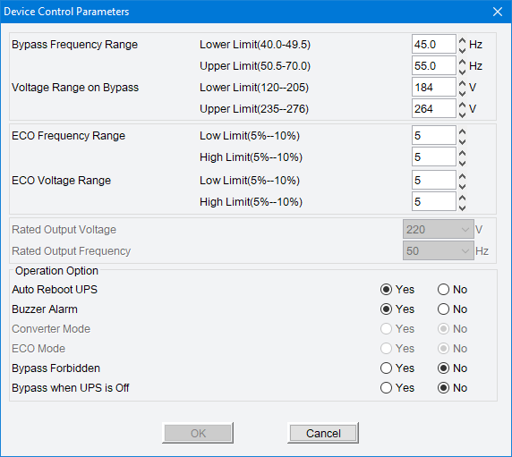 Часть установок присутствует, но на представленных чуть выше скриншотах они являются неактивными. Вспоминаем: для входа в меню источник следует перевести в режим Standby или Bypass, делаем это и получаем возможность дистанционного выбора выходного напряжения и частоты, включения режима Eco или конвертора.