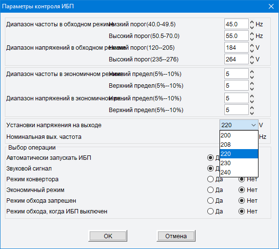 При этом для частоты отсутствует ASF, а для напряжения добавились два значения 200 и 208 вольт, которые можно выбрать и даже нажать «ОК», но будет установлено напряжение 220 В.