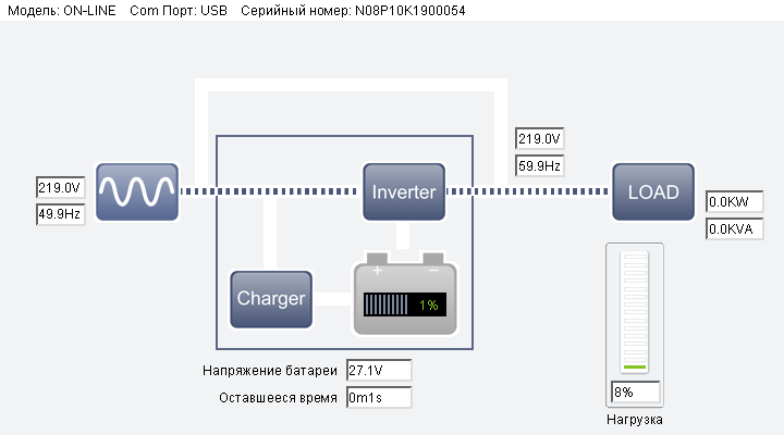 Здесь не очень понятными являются показания для нагрузки: с одной стороны, «0.0kW/0.0kVA», а с другой — 8% от максимума.