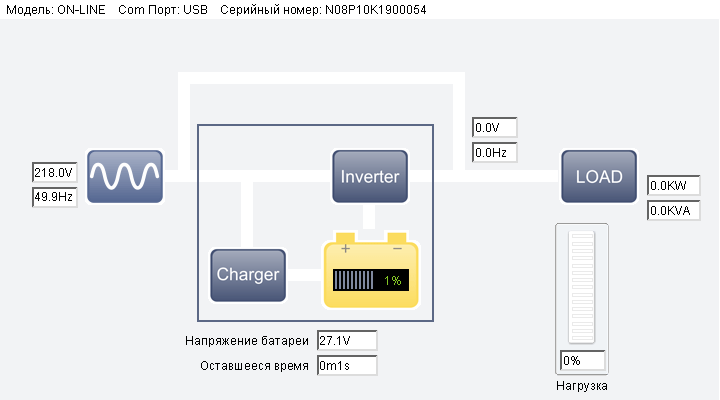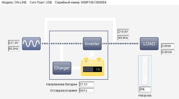 Переход на батарею или на байпас приводит к соответствующей смене «потоков энергии» на картинке, и даже если выключить ИБП кнопкой, оставив его подключенным к розетке, изображение тоже поменяется.