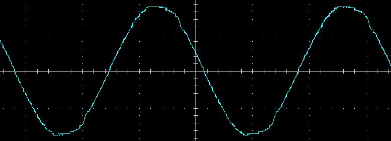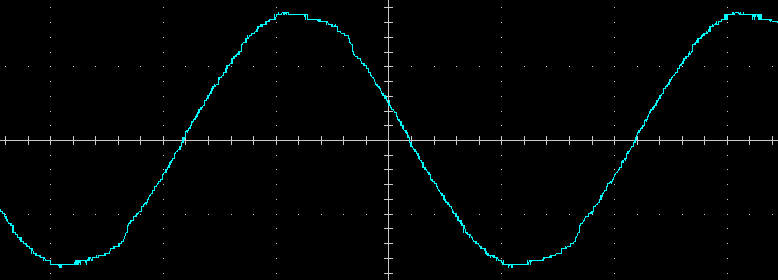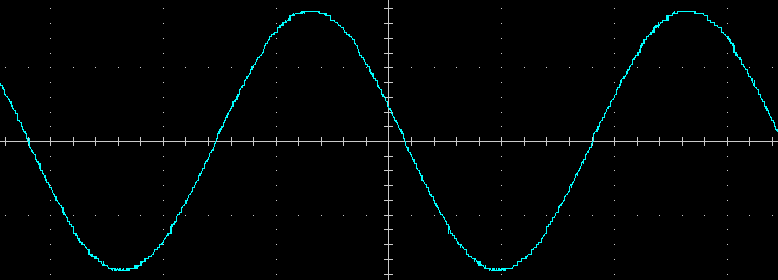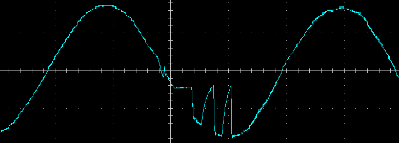 Вот ее внешний вид на нагрузках 100 Вт и 400 В·А (PF = 0,7) с установкой частоты на выходе 50 Гц, цена деления по горизонтали здесь и далее 5 мс: