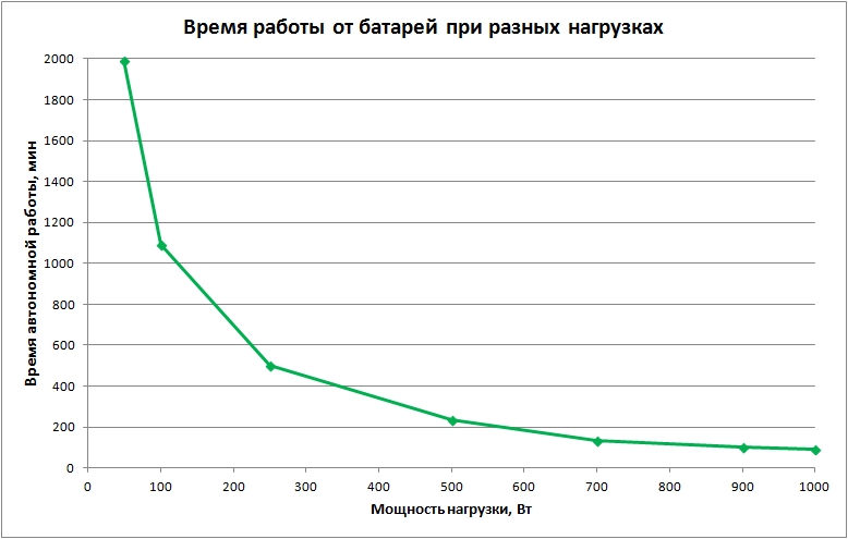 Перейдем к тестированию автономной работы Ippon Innova G2 Euro 1000L с разными нагрузками. Вот результаты в виде графика: