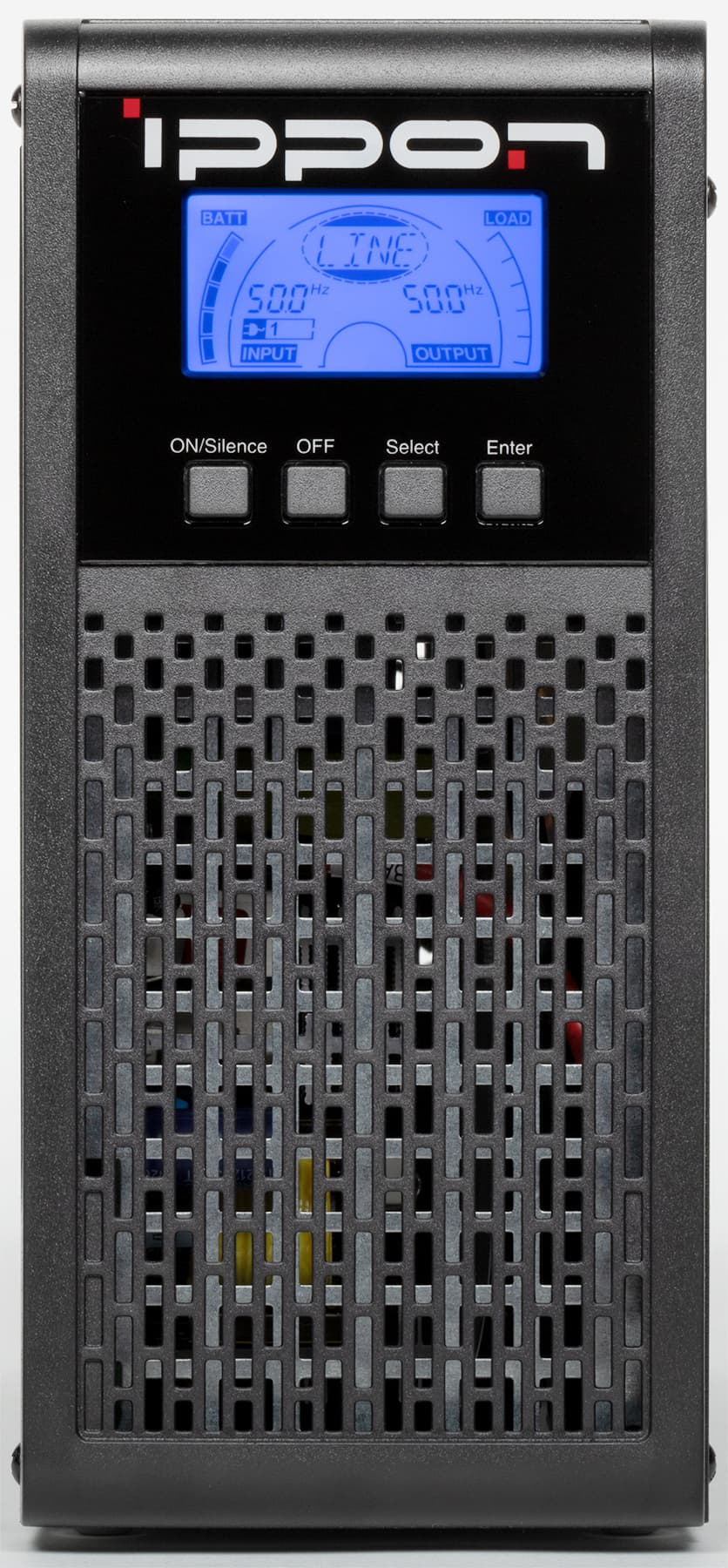 На лицевой панели находятся ЖК-дисплей и четыре управляющие кнопки. Крайняя левая включает и выключает источник (точнее, задействует подачу напряжения на выходы), запускает тест батарей и управляет звуковыми сигналами. Следующая кнопка отключает нагрузки либо задействует их питание через байпас (если такая функция активирована в меню), а две правых нужны для настроек в меню.