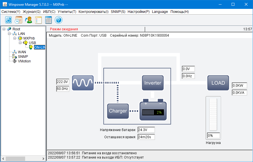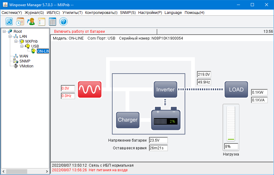 Итак: когда нагрузка не подключена, отображается 0%. Активная нагрузка 50 Вт оценивалась как 0,0 кВт (это не беда), 0,1 кВ·А (а это немного странно) и 6%, что с учетом максимальной мощности в 900 Вт почти точно; для 200 Вт показания были 0,2 кВт, 0,2 кВ·А (то есть вполне нормально) и 19% (чуть занижено); нагрузка 700 Вт отобразилась как 0,6 кВт, 0,7 кВ·А (приемлемо, но опять непонятна разница между ваттами и вольт-амперами) и 66% (занижено, и довольно сильно: должно быть 77-78 процентов). Для реактивной нагрузки 400 В·А с PF = 0,7 показания были 0,3 кВт, 0,3 кВ·А и 31%, то есть тоже заметно меньше, чем должно быть. Таким образом, на роль измерителя мощности сочетание ИБП с программой Winpower не подходит, но для оценки величины нагрузок годится.